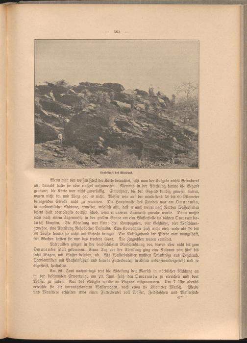 Patrouillen gingen in der beabsichtigten Marschrichtung vor, waren aber nicht bis zum Omuramba selbst gekommen. Einen Tag vor der Abteilung ging eine Kolonne von fünf bis sechs Wagen, mit Wasser beladen, ab. Als Wasserbehälter mußten Tränktröge aus Segeltuch, Proviantkisten mit Blecheinsätzen und leinene Futterbeutel, in Kisten nebeneinandergestellt und so abgesteift, herhalten.