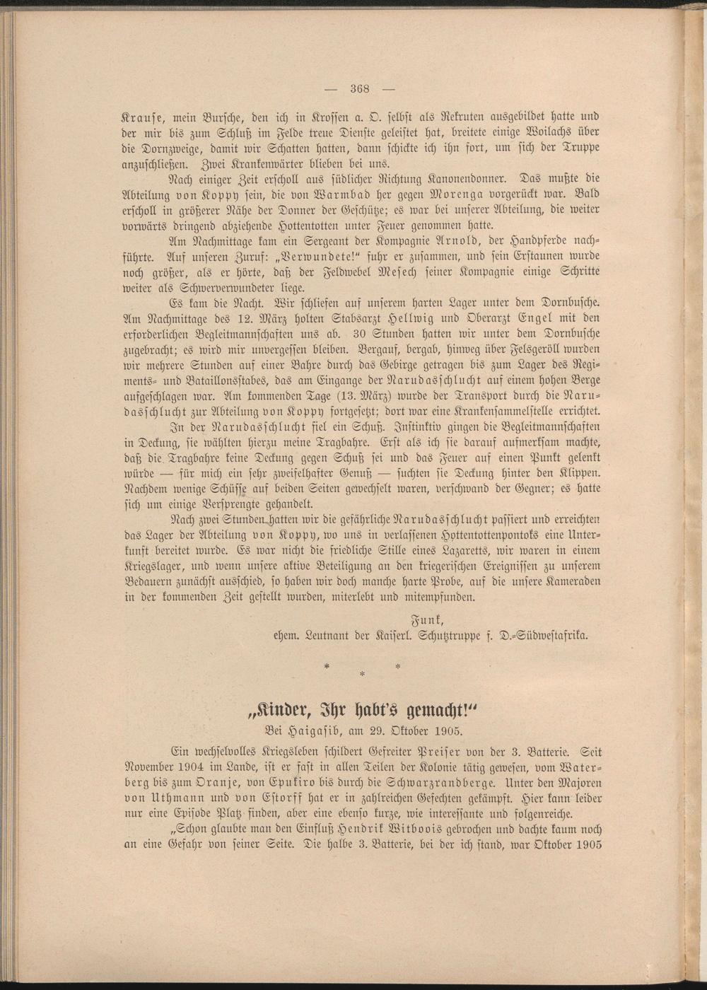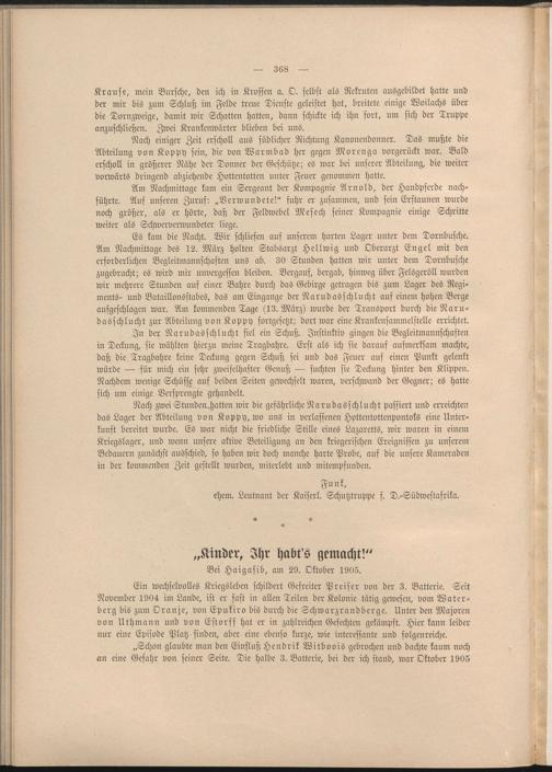 Ein wechselvolles Kriegsleben schildert Gefreiter Preiser von der 3. Batterie. Seit November 1904 im Lande, ist er fast in allen Teilen der Kolonie tätig gewesen, vom Water- berg bis zum Oranje, von Epukiro bis durch die Schwarzrandberge. Unter den Majoren von Uthmann und von Estorff hat er in zahlreichen Gefechten gekämpft. Hier kann leider nur eine Episode Platz finden, aber eine ebenso kurze, wie interessante und folgenreiche.
