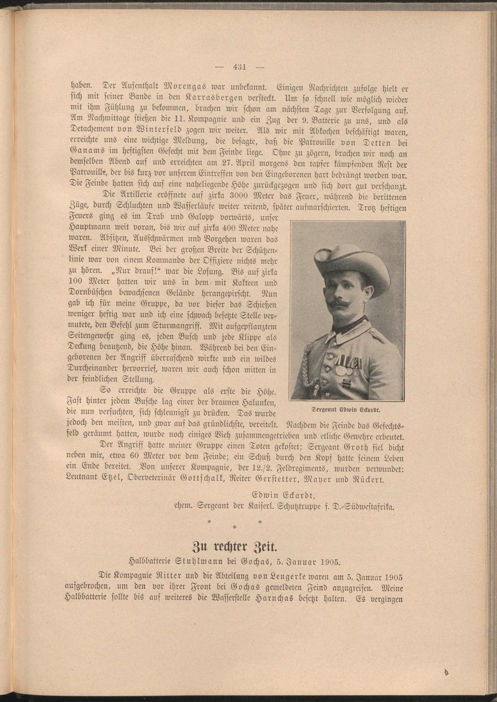 Die Artillerie eröffnete auf zirka 3000 Meter das Feuer, während die berittenen Züge, durch Schluchten und Wasserläufe weiter reitend, später aufmarschierten. Trotz heftigen Feuers ging es im Trab und Galopp vorwärts, unser Hauptmann weit voran, bis wir auf zirka 400 Meter nahe waren. Absitzen, Ausschwärmen und Vorgehen waren das Werk einer Minute. Bei der großen Breite der Schützenlinie war von einem Kommando der Offiziere nichts mehr zu hören. „Nur drauf!" war die Losung. Bis auf zirka 100 Meter hatten wir uns in dem mit Kakteen und Dornbüschen bewachsenen Gelände herangepirscht. Nun gab ich für meine Gruppe, da vor dieser das Schießen weniger heftig war und ich eine schwach besetzte Stelle vermutete, den Befehl zum Sturmangriff. Mit aufgepflanztem Seitengewehr ging es, jeden Busch und jede Klippe als Deckung benutzend, die Höhe hinan. Während bei den Eingeborenen der Angriff überraschend wirkte und ein wildes Durcheinander hervorrief, waren wir auch schon mitten in der feindlichen Stellung.