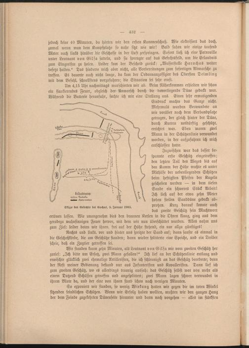 Inzwischen war das besser bespannte erste Geschütz eingetroffen; den letzten Teil des Weges bis auf den Kamm der Höhe mußte es unter Mithilfe der nebenliegenden Schützen beim heftigsten Pfeifen der Kugeln geschoben werden — in dem tiefen Sande ein schweres Stück Arbeit! Ich ließ auf der etwa zehn Meter hohen steilen Sanddüne gedeckt abprotzen. Kurz darauf konnte auch das zweite Geschütz sein Machtwort ertönen lassen. Wie unangenehm dies den braunen Kerlen in die Ohren klang, ging aus dem geradezu wahnsinnigen Feuer hervor, mit dem wir nun überschüttet wurden. Alles nahm uns zum Ziel: leider boten wir ihnen, frei auf der Höhe stehend, ein nur allzu günstiges!