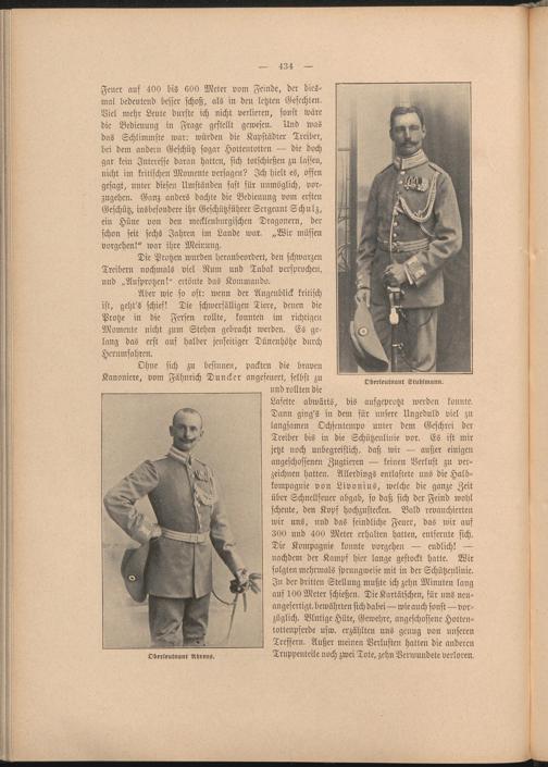 Lafette abwärts, bis aufgeprotzt werden konnte. Dann ging's in dem für unsere Ungeduld viel zu langsamen Ochsentcmpo unter dem Geschrei der Treiber bis in die Schützenlinie vor. Es ist mir jetzt noch unbegreiflich, daß wir — außer einigen angeschossenen Zugtieren — keinen Verlust zu verzeichnen hatten. Allerdings entlastete uns die Halb- kompagnie von Livonius, welche die ganze Zeit über Schnellfeuer abgab, so daß sich der Feind wohl scheute, den Kopf hochzustecken. Bald revanchierten wir uns, und das feindliche Feuer, das wir auf 300 und 400 Meter erhalten hatten, entfernte sich. Die Kompagnie konnte vorgehen — endlich! — nachdem der Kampf hier lange gestockt hatte. Wir folgten mehrmals sprungweise mit in der Schützenlinie. In der dritten Stellung mußte ich zehn Minuten lang auf 100 Meter schießen. Die Kartätschen, für uns neuangefertigt, bewährten sich dabei—wie auch sonst — vorzüglich. Blutige Hüte, Gewehre, angeschossene Hottentottenpferde usw. erzählten uns genug von unseren Treffern. Außer meinen Verlusten hatten die anderen Truppenteile noch zwei Tote, zehn Verwundete verloren.