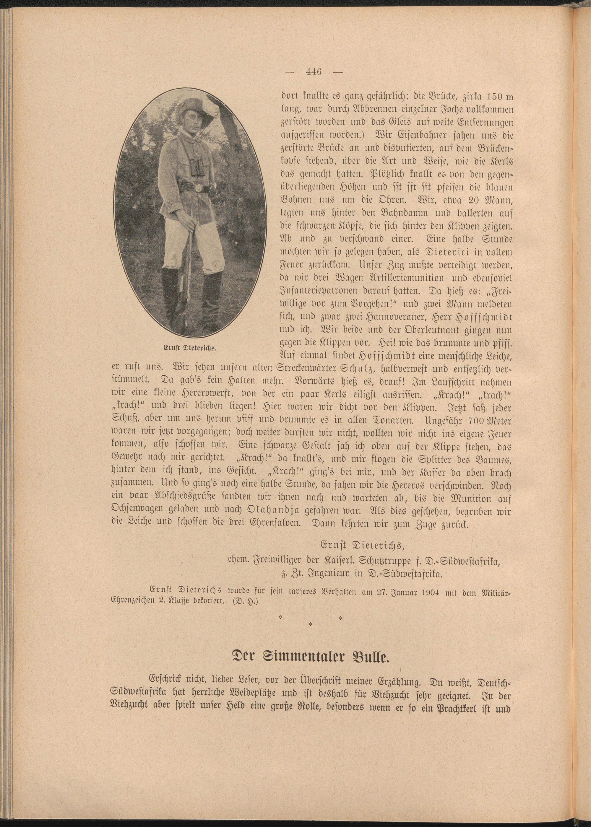 Ernst Dicterichs wurde siir sein tapferes Verhalten am 27. Januar 1901 mit dem Militär- Ehrenzeichen 2. Klasse dekoriert. (D. H.)