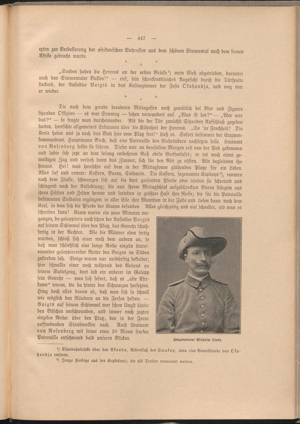 „Soeben haben die Hcreros an der ersten Brücke Z mein Vieh abgetrieben, darunter auch den Simmentaler Bullen!" — rief, sein schreckensbleiches Angesicht durch die Türspalte steckend, der Ansiedler Voigts in das Kasinozimmer der Feste Okahandja, und weg war er wieder.