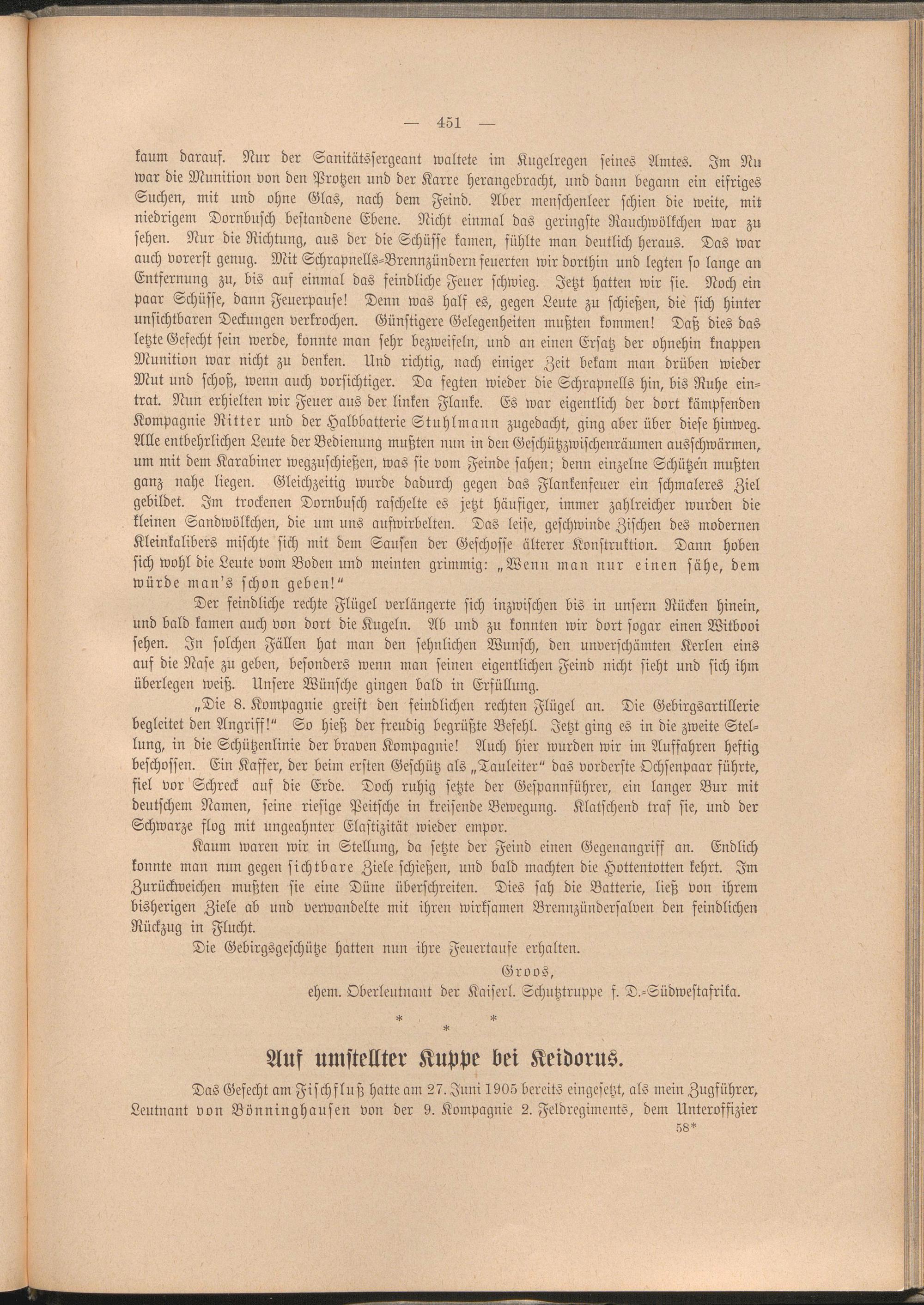 Das Gefecht am Fischfluß hatte am 27. Juni 1905 bereits eingesetzt, als mein Zugführer, Leutnant von Bönninghausen von der 9. Kompagnie 2. Feldregiments, dem Unteroffizier