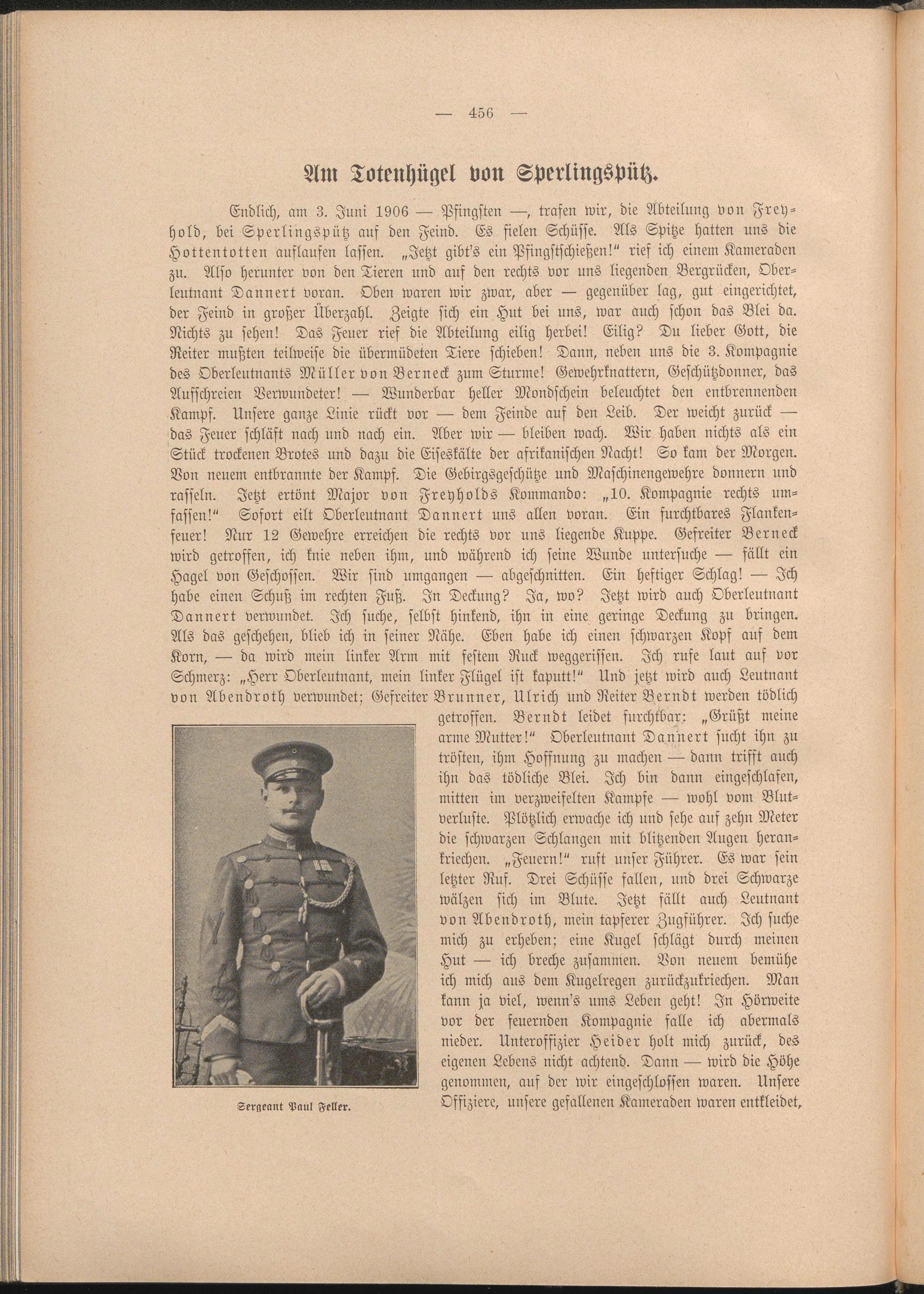 getroffen. Berndt leidet furchtbar: „Grüßt meine arme Mutter!" Oberleutnant Dannert sucht ihn zu trösten, ihm Hoffnung zu machen — dann trifft auch ihn das tödliche Blei. Ich bin dann eingeschlafen, mitten im verzweifelten Kampfe — wohl vom Blutverluste. Plötzlich erwache ich und sehe auf zehn Meter die schwarzen Schlangen mit blitzenden Augen heran- kriechen. „Feuern!" ruft unser Führer. Es war sein letzter Ruf. Drei Schüsse fallen, und drei Schwarze wälzen sich im Blute. Jetzt fällt auch Leutnant von Abendroth, mein tapferer Zugführer. Ich suche mich zu erheben; eine Kugel schlägt durch meinen Hut — ich breche zusammen. Von neuem bemühe ich mich aus dem Kugelregen zurückzukriechen. Man kann ja viel, wenn's ums Leben geht! In Hörweite vor der feuernden Kompagnie falle ich abermals nieder. Unteroffizier Heider holt mich zurück, des eigenen Lebens nicht achtend. Dann — wird die Höhe genommen, auf der wir eingeschlossen waren. Unsere Offiziere, unsere gefallenen Kameraden waren entkleidet.