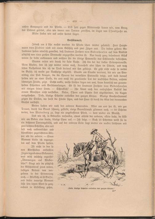 Und wie ich, in Gedanken versunken, etwas abseits der anderen, allein suche, da fällt mir am Boden eine breite, blutige Spur auf. — Ich folge. — Nach 15 Schritten weist sie in ein dichteres Dornengebüsch, und auf der anderen Seite liegt wieder ein nackter Leichnam mit zwei leichten Schüssen, aber mit fast noch unkenntlicher und schrecklicher zugerichtetem Körper als die andern. — Einen Moment bleibe ich regungslos auf dem Pferde halten.