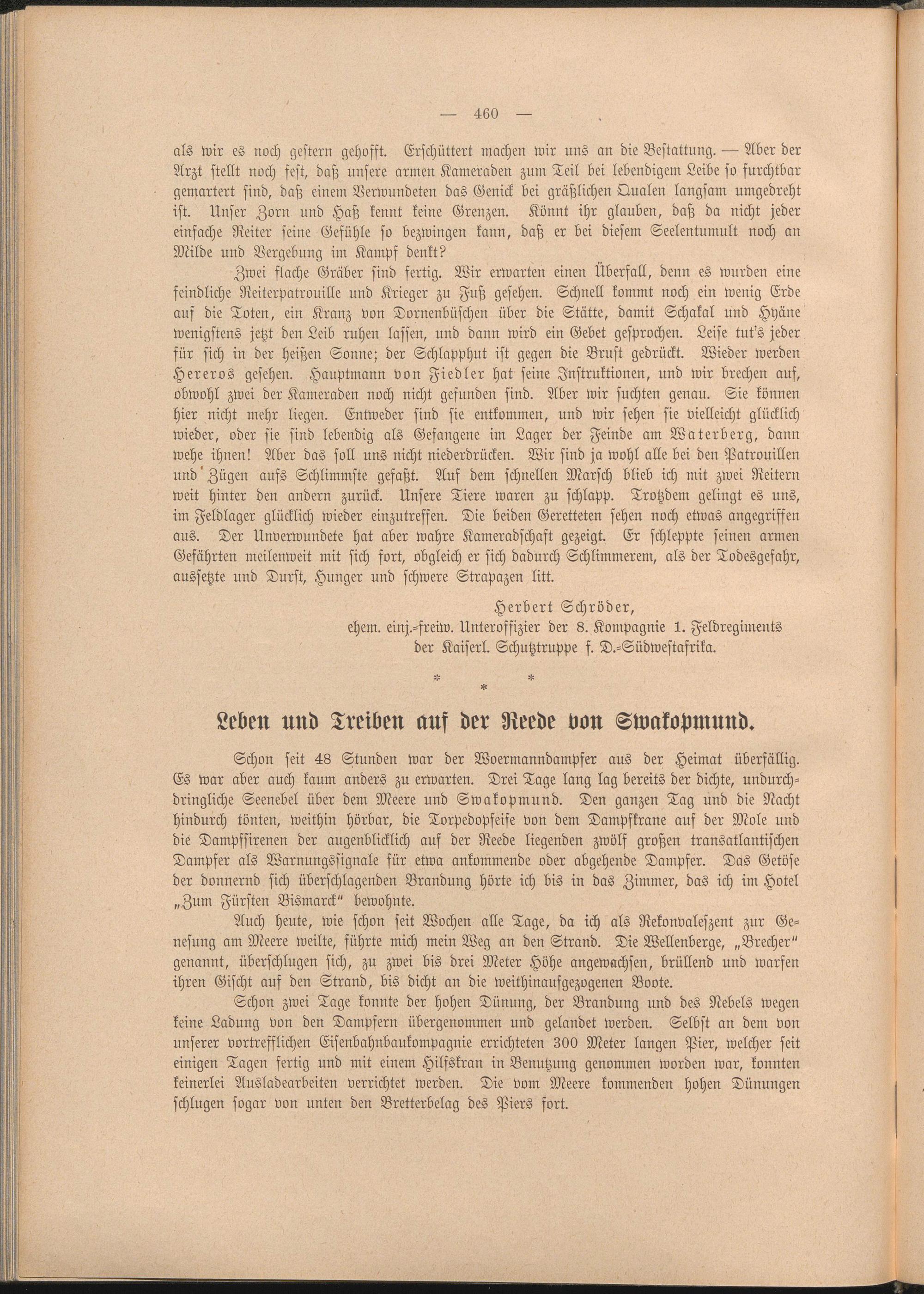 Schon seit 48 Stunden war der Woermanndampfer aus der Heimat überfällig. Es war aber auch kaum anders zu erwarten. Drei Tage lang lag bereits der dichte, undurchdringliche Seenebel über dem Meere und Swakopmund. Den ganzen Tag und die Nacht hindurch tönten, weithin hörbar, die Torpedopfeife von dem Dampfkrane auf der Mole und die Dampfsirenen der augenblicklich aus der Reede liegenden zwölf großen transatlantischen Dampfer als Warnungssignale für etwa ankommende oder abgehende Dampfer. Das Getöse der donnernd sich überschlagenden Brandung hörte ich bis in das Zimmer, das ich im Hotel „Zum Fürsten Bismarck" bewohnte.