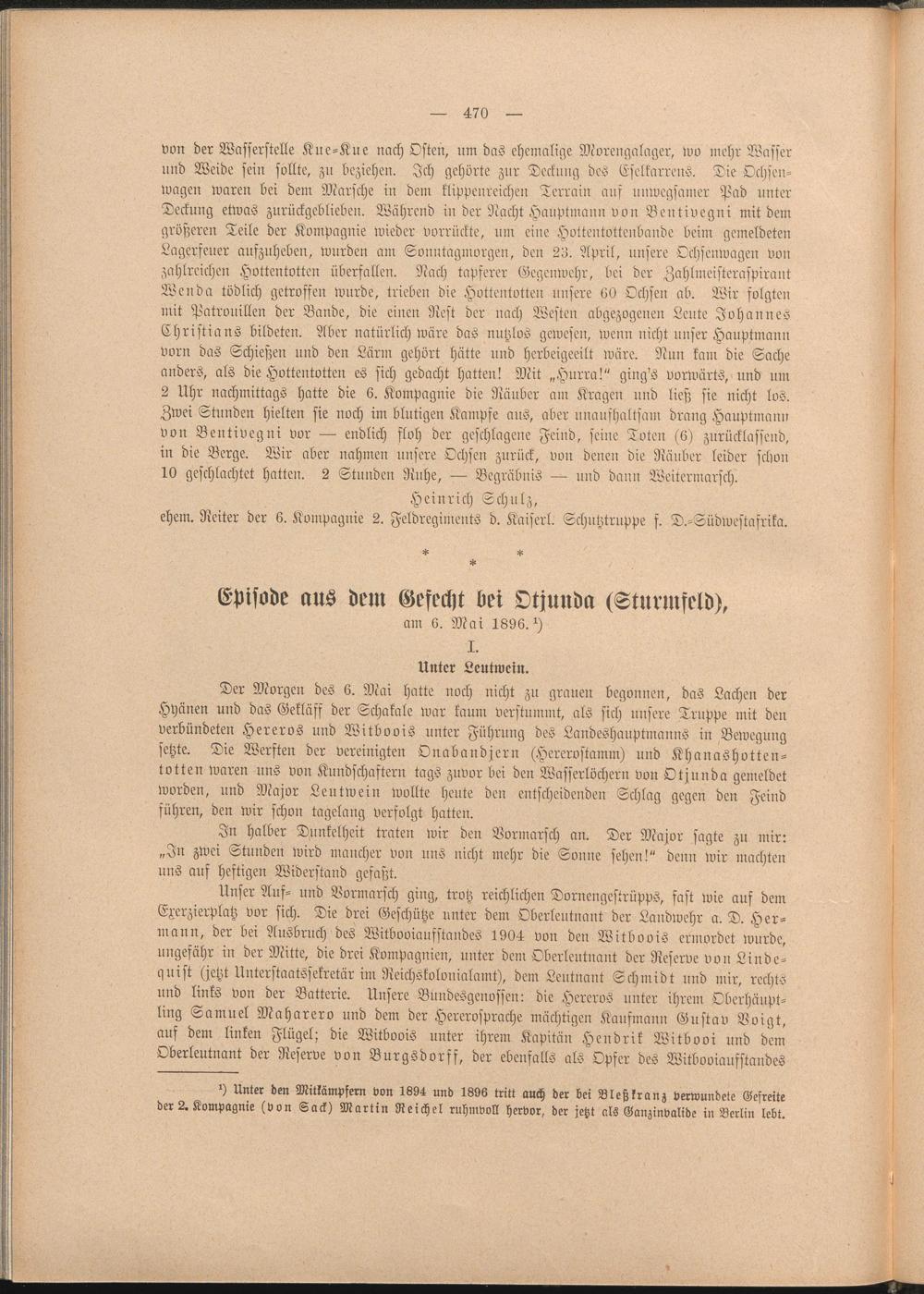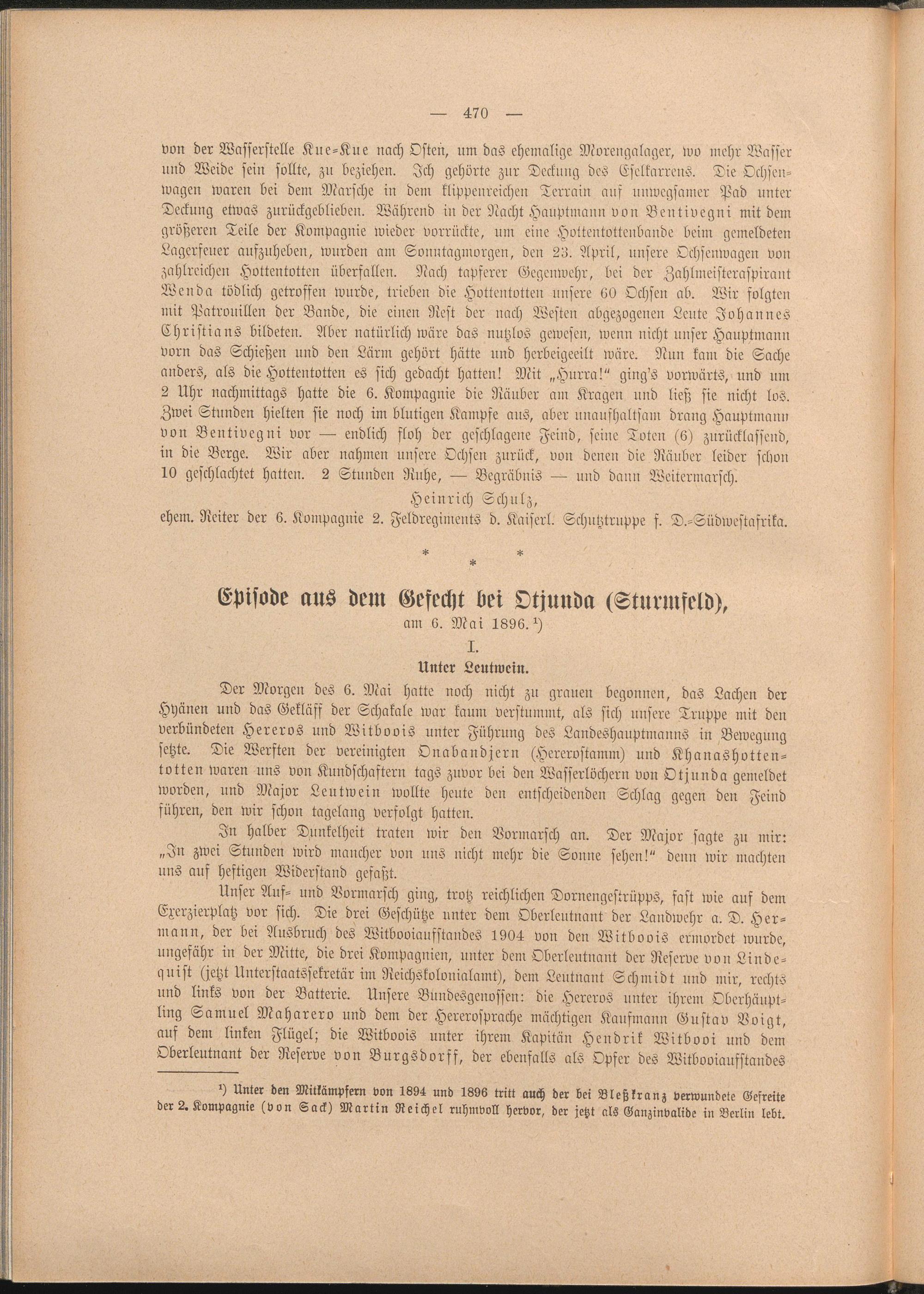 Unser Auf- und Vormarsch ging, trotz reichlichen Dornengestrüpps, fast wie auf dem Exerzierplatz vor sich. Die drei Geschütze unter dem Oberleutnant der Landwehr a. D. Hermann, der bei Ausbruch des Witbooianfstaudes 1904 von den Witboois ermordet wurde, ungefähr in der Mitte, die drei Kompagnien, unter dein Oberleutnant der Reserve von Linde- quist (jetzt Uuterstaatssekretär im Neichskolonialamt), dem Leutnant Schmidt und mir, rechts und links von der Batterie. Unsere Bundesgenossen: die Hercros unter ihrem Oberhäuptling Samuel Maharero und dem der Hererosprache mächtigen Kaufmann Gustav Vvigt, auf dem linken Flügel; die Witboois unter ihrem Kapitän Hendrik Witbooi und dem Oberleutnant der Reserve von Burgsdorff, der ebenfalls als Opfer des Witboviaufstandes