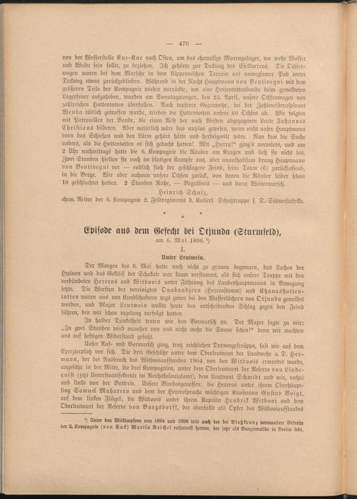 Der Morgen des 6. Mai hatte noch nicht zu grauen begonnen, das Lachen der Hyänen und das Gekläff der Schakale war kaum verstummt, als sich unsere Truppe mit den verbündeten Hereros und Witboois unter Führung des Landeshauptmanns in Bewegung setzte. Die Werften der vereinigten Onabandjern (Hcrervstamm) und Khanashottentotten waren uns von Kundschaftern tags zuvor bei den Wasserlöchern von Otjunda gemeldet worden, und Major Leutwein wollte heute den entscheidenden Schlag gegen den Feind führen, den wir schon tagelang verfolgt hatten.