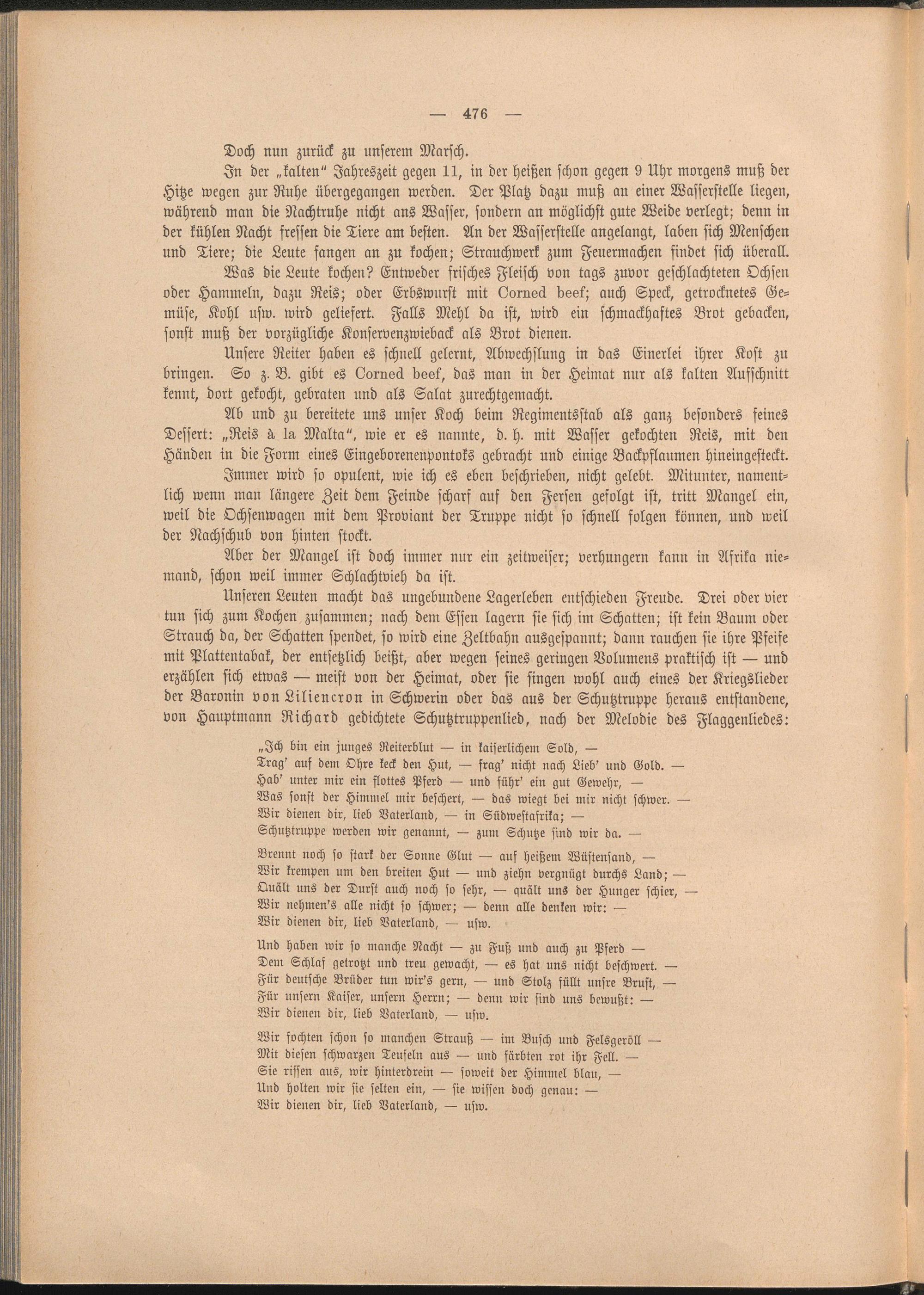 Unseren Leuten macht das ungebundene Lagerleben entschieden Freude. Drei oder vier tun sich zum Kochen zusammen; nach dem Essen lagern sie sich im Schatten; ist kein Baum oder Strauch da, der Schatten spendet, so wird eine Zeltbahn ausgespannt; dann rauchen sie ihre Pfeife mit Plattentabak, der entsetzlich beißt, aber wegen seines geringen Volumens praktisch ist — und erzählen sich etwas — meist von der Heimat, oder sie singen wohl auch eines der Kriegslieder der Baronin von Liliencron in Schwerin oder das aus der Schutztruppe heraus entstandene, von Hauptmann Richard gedichtete Schutztruppenlied, nach der Melodie des Flaggenliedes: