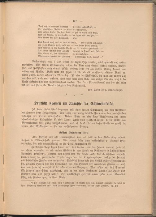 Ich habe dieses Werk begonnen mit einer kurzen Schilderung aus dem Aufstande der Hereros beim Kriegsbeginn. Wir sahen eine mutige deutsche Frau unter den vernichtenden Schlägen der Kirris niedersinken. Meiner Bitte um eine kurze Schilderung aus ihrem schreckensbleichen Kriegsleben ist diese Dame, Frau von Falkenhausen, deren Gatte von Mörderhänden siel, gütig nachgekommen, und ich danke ihr an dieser Stelle — gewiß im Sinne aller Mitkämpfer — für den nachfolgenden Beitrag.