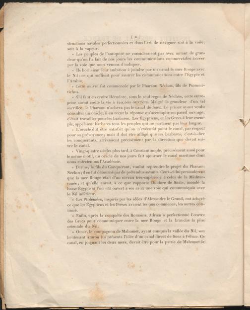 « S’il faut en croire Hérodote, sous le seul règne de Néchos, cette entreprise aurait coûté la vie à 120,000 ouvriers. Malgré la grandeur d’un tel sacrifice, le Pharaon n’acheva pas le canal de Suez. Ce prince ayant voulu consulter un oracle, il en reçut la réponse qu’accomplir un pareil ouvrage, c’était travailler pour les barbares. Les Egyptiens, et les Grecs à leur exemple, appelaient barbares tous les peuples qui ne parlaient pas leur langue.