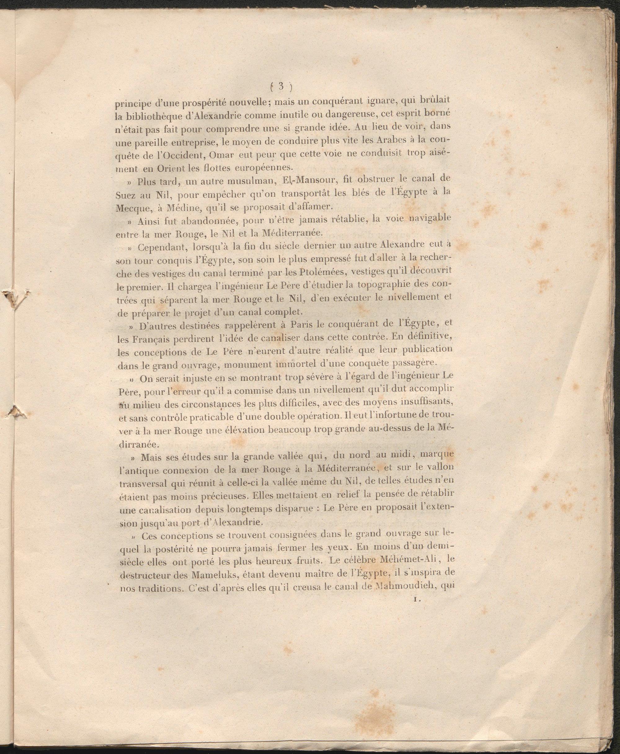 » Ces conceptions se trouvent consignées dans le grand ouvrage sur lequel la postérité ne pourra jamais fermer les yeux. Eu moins d’un demi- siècle elles ont porté les plus heureux fruits. Le célèbre Méhémet-Ali, le destructeur des Mameluks, étant devenu maître de l’Egypte, il s'inspira de nos traditions. C’est d'après elles qu’il creusa le canal de Mahmoudieh, qui