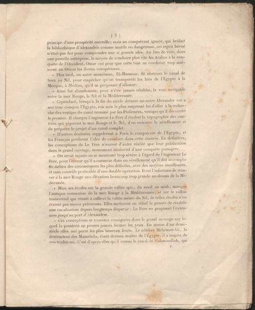 » Mais ses études sur la grande vallée qui, du nord au midi, marque l’antique connexion de la mer Rouge à la Méditerranée, et sur le vallon transversal qui réunit à celle-ci la vallée même du Nil, de telles études n’en étaient pas moins précieuses. Elles mettaient en relief la pensée de rétablir une canalisation depuis longtemps disparue : Le Père en proposait l’extension jusqu’au port d’Alexandrie.