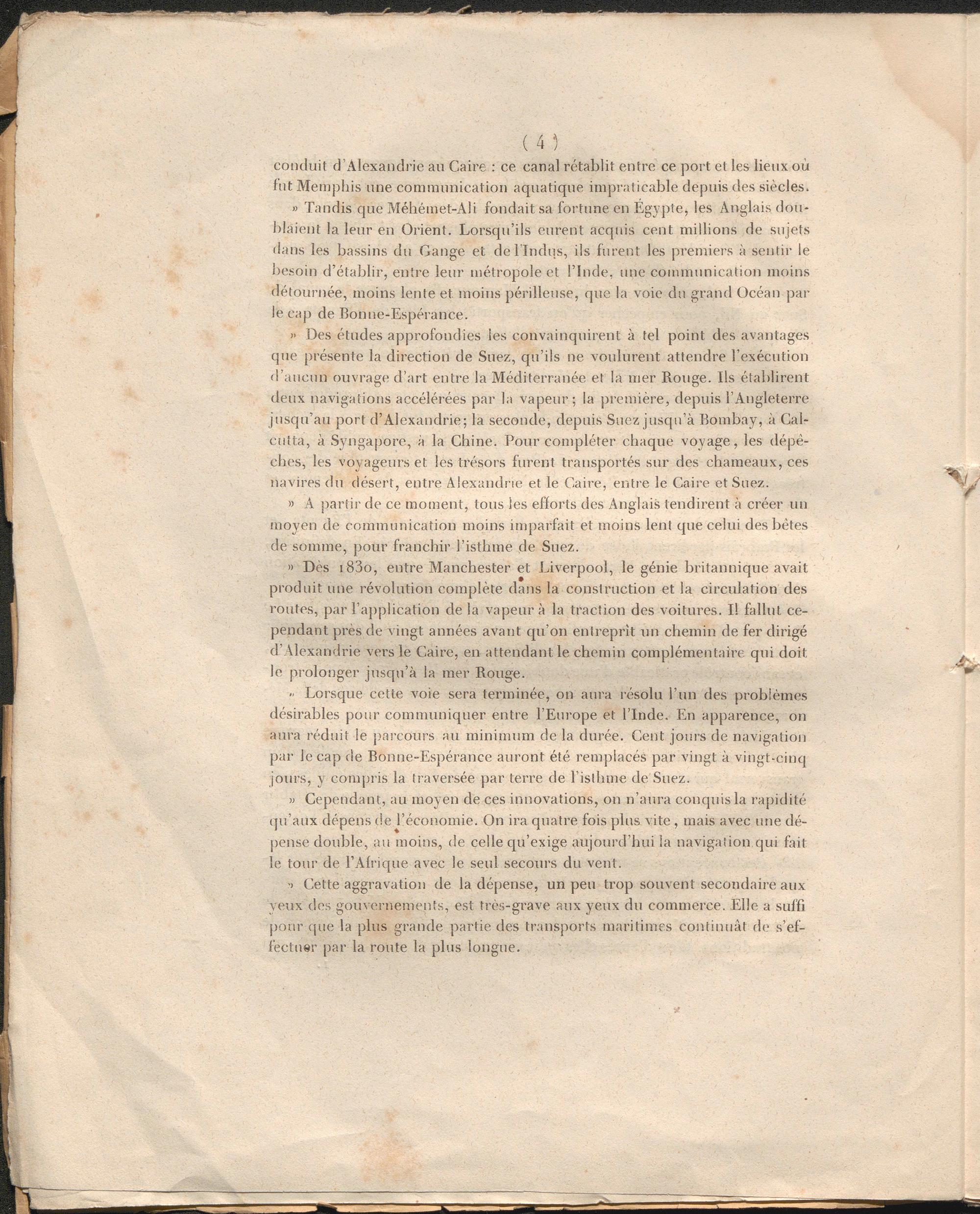 » Tandis que Méhémet-Ali fondait sa fortune en Égypte, les Anglais doublaient la leur en Orient. Lorsqu’ils eurent acquis cent millions de sujets dans les bassins du Gange et dellndus, ils furent les premiers à sentir le besoin d’établir, entre leur métropole et l’Inde, une communication moins détournée, moins lente et moins périlleuse, que la voie du grand Océan par le cap de Bonne-Espérance.
