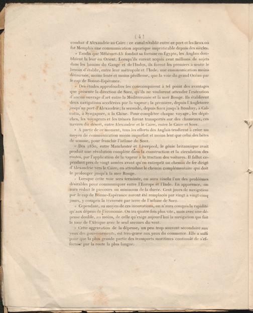 Lorsque cette voie sera terminée, on aura résolu l’un des problèmes désirables pour communiquer entre l’Europe et l’Inde. En apparence, on aura réduit le parcours au minimum de la durée. Cent jours de navigation par le cap de Bonne-Espérance auront été remplacés par vingt à vingt-cinq jours, y compris la traversée par terre de l’isdnne de Suez.