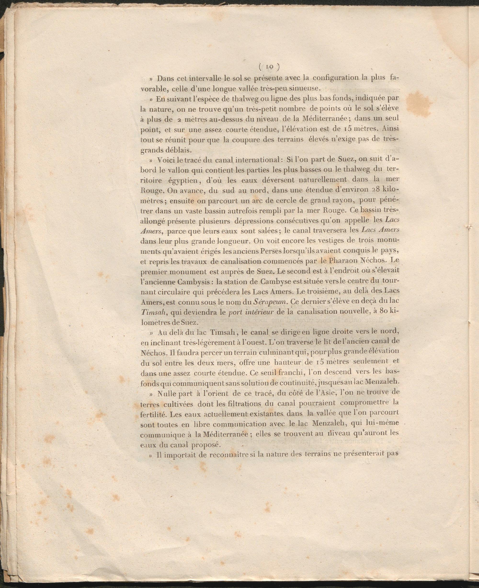 » Nulle part à l’orient de ce tracé, du côté de l’Asie, l’on ne trouve de terres cultivées dont les filtrations du canal pourraient compromettre la fertilité. Les eaux actuellement existantes dans la vallée que l’on parcourt sont toutes en libre communication avec le lac Menzaleh, qui lui-même communique à la Méditerranée ; elles se trouvent au niveau qu’auront, les eaux du canal proposé.