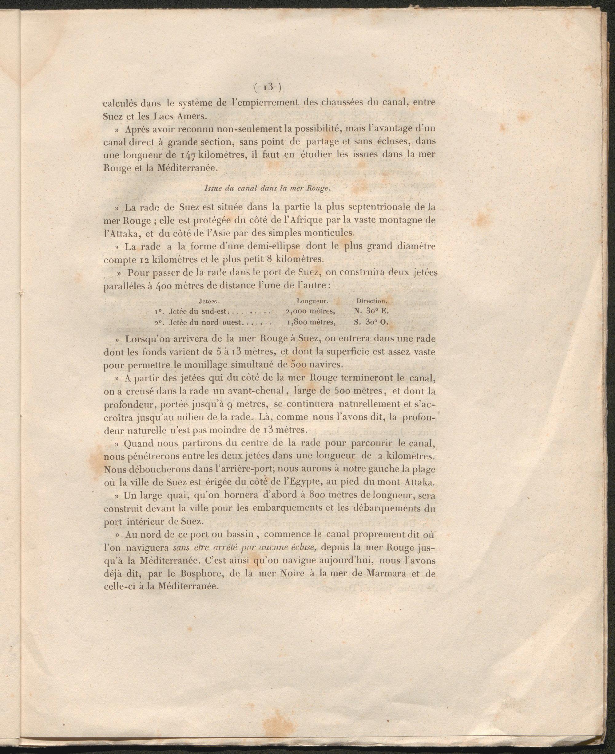 » Après avoir reconnu non-seulement la possibilité, mais l’avantage d’un canal direct à grande section, sans point de partage et sans écluses, dans une longueur de 147 kilomètres, il faut en étudier les issues dans la mer Rouge et la Méditerranée.