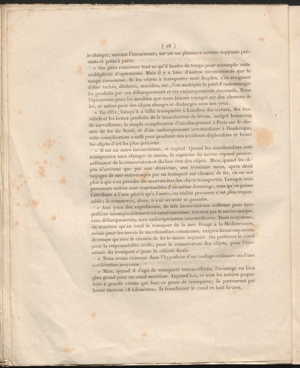 » Aux yeux des expéditeurs, de tels inconvénients suffiront pour faire préférer incomparablement un canal maritime, traversé par le navire unique, sans débarquements, sans embarquements intermédiaires. Dans ce système, on trouvera qu’au lotal le transport de la mer Rouge à la Méditerranée, même pour les envois de marchandises communes, exigera beaucoup moins de temps qu’avec le chemin de ferle mieux organisé. On préférera le canal pour la responsabilité réelle, pour la conservation des objets, pour l’économie du transport et pour la célérité finale.