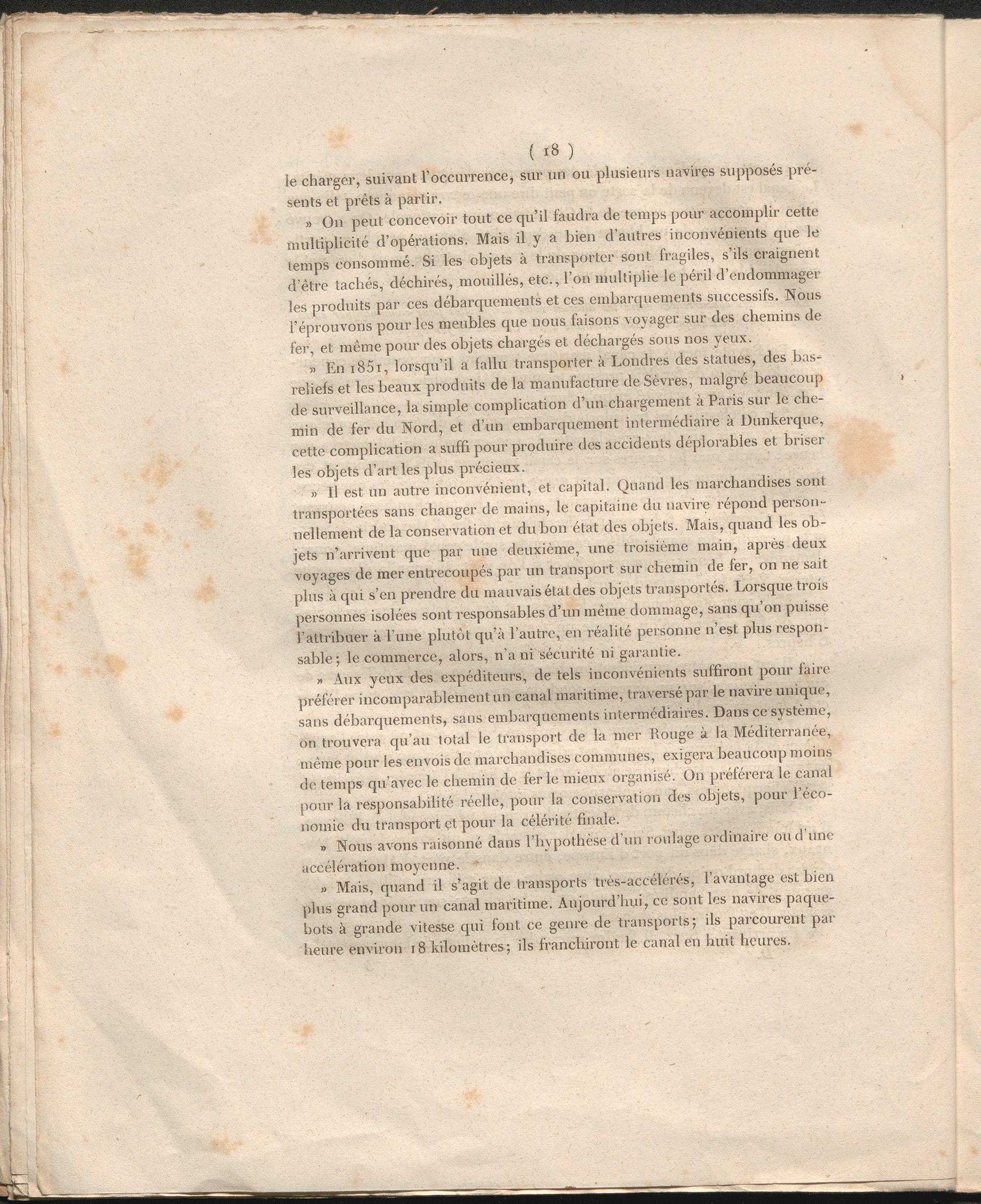 » On peut concevoir tout ce qu’il faudra de temps pour accomplir cette multiplicité d’opérations. Mais il y a bien d’autres inconvénients que le temps consommé. Si les objets à transporter sont fragiles, s’ils craignent d’être tachés, déchirés, mouillés, etc., l’on multiplie le péril d’endommager les produits par ces débarquements et ces embarquements successifs. Nous l’éprouvons pour les meubles que nous faisons voyager sur des chemins de fer, et même pour des objets chargés et déchargés sous nos yeux.