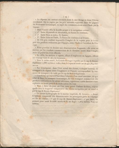 » Par conséquent, dans l’état actuel des choses, à chaque tonneau de transport à la vapeur entre l’Angleterre et l’Egypte correspondent 39 tonneaux de transport à la voile par le cap de Bonne-Espérance.