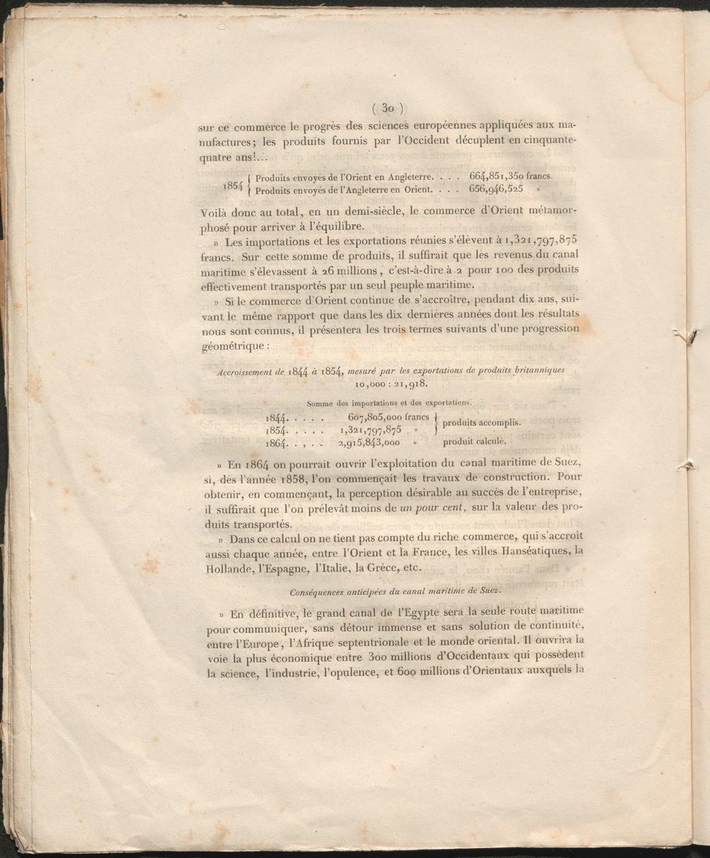 » En 1864 on pourrait ouvrir l’exploitation du canal maritime de Suez, si, dès l’année 1858, l’on commençait les travaux de construction. Pour obtenir, en commençant, la perception désirable au succès de l’entreprise, il suffirait que l’on prélevât moins de un pour cent, sur la valeur des produits transportés.
