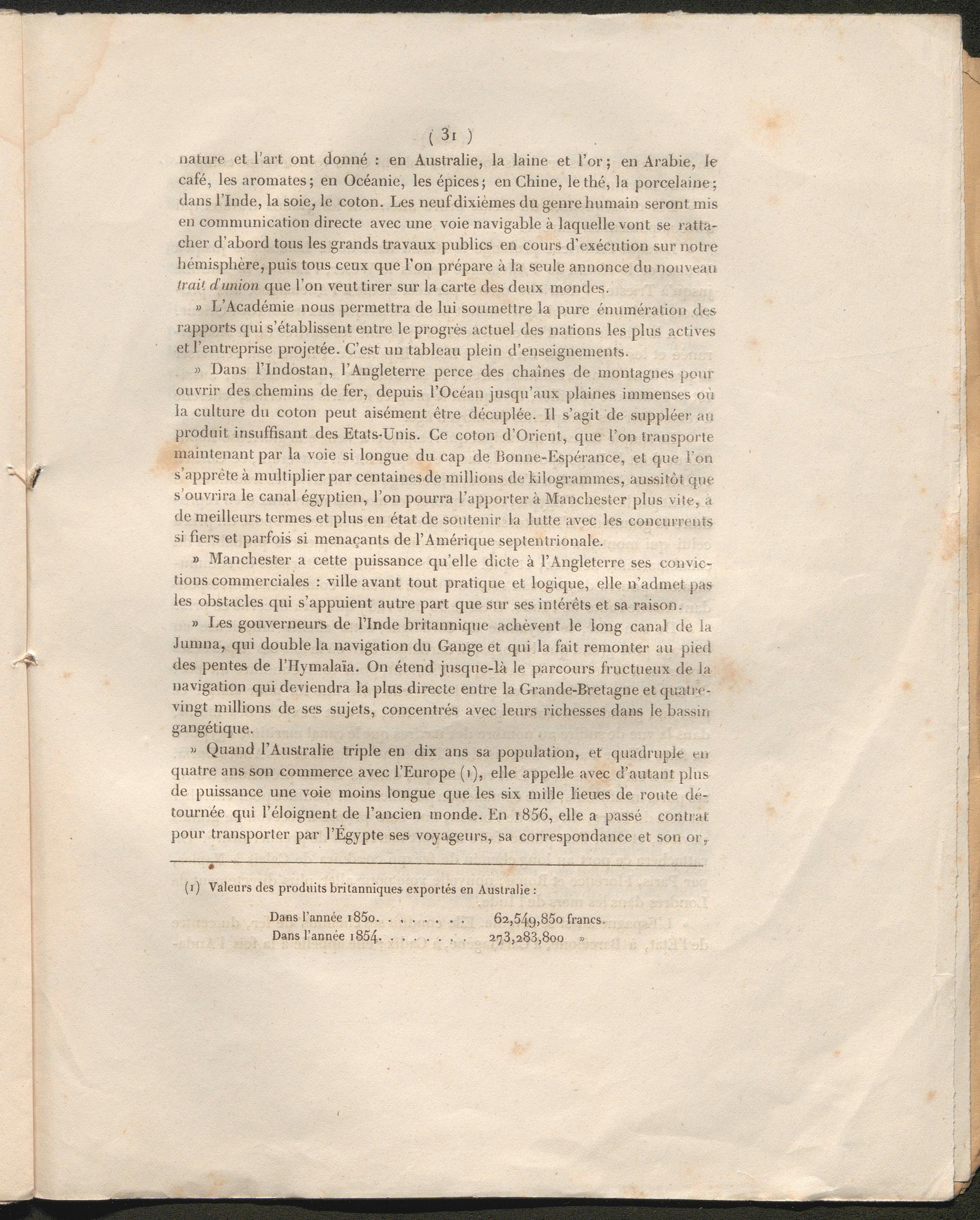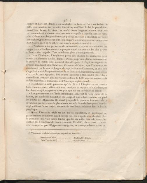 » Quand l’Australie triple en dix ans sa population, et quadruple en quatre ans son commerce avec l’Europe ( 1 ), elle appelle avec d’autant plus de puissance une voie moins longue que les six mille lieues de route détournée qui l’éloignent de l’ancien monde. En i856, elle a passé contrat pour transporter par l’Egypte ses voyageurs, sa correspondance et son or,