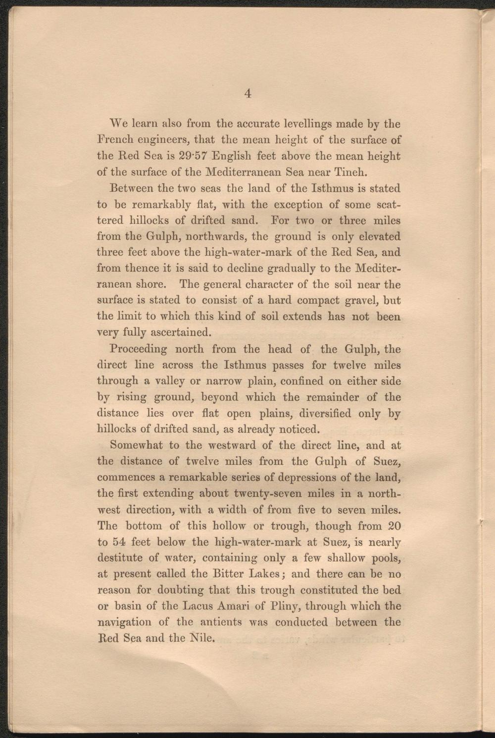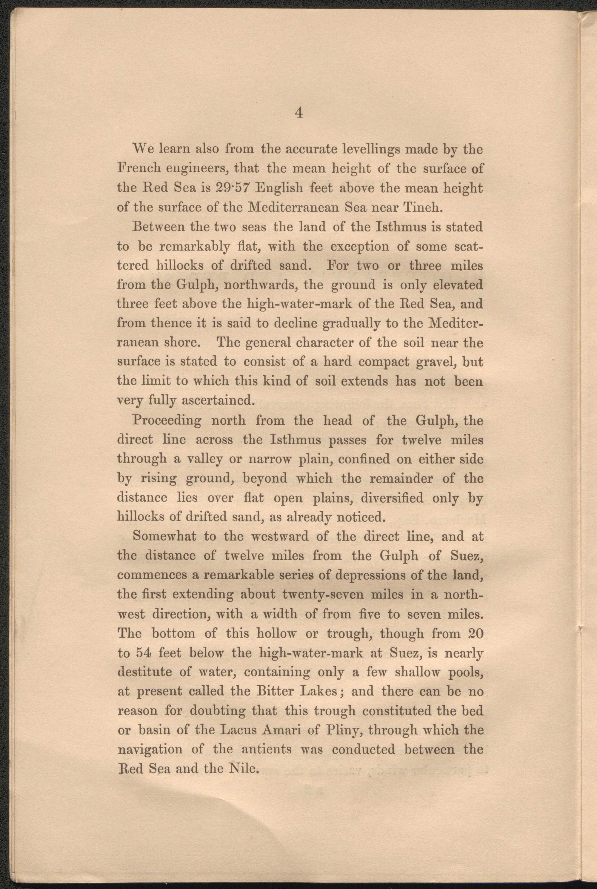Somewhat to the westward of the direct line, and at the distance of twelve miles from the Gulph of Suez, commences a remarkable series of depressions of the land, the first extending about twenty-seven miles in a northwest direction, with a width of from five to seven miles. The bottom of this hollow or trough, though from 20 to 54 feet below the high-water-mark at Suez, is nearly destitute of water, containing only a few shallow pools, at present called the Bitter Lakes; and there can be no reason for doubting that this trough constituted the bed or basin of the Lacus Amari of Pliny, through which the navigation of the antients was conducted between the Red Sea and the Nile.