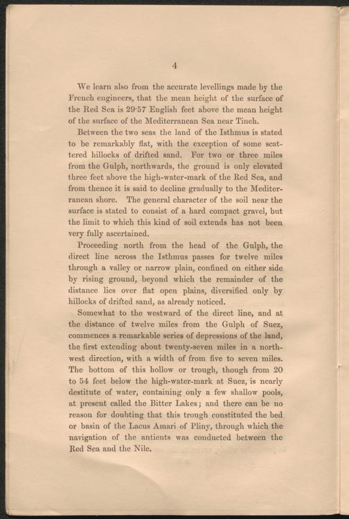 Between the two seas the land of the Isthmus is stated to be remarkably flat, with the exception of some scattered hillocks of drifted sand. For two or three miles from the Gulph, northwards, the ground is only elevated three feet above the high-water-mark of the Red Sea, and from thence it is said to decline gradually to the Mediterranean shore. The general character of the soil near the surface is stated to consist of a hard compact gravel, but the limit to which this kind of soil extends has not been very fully ascertained.