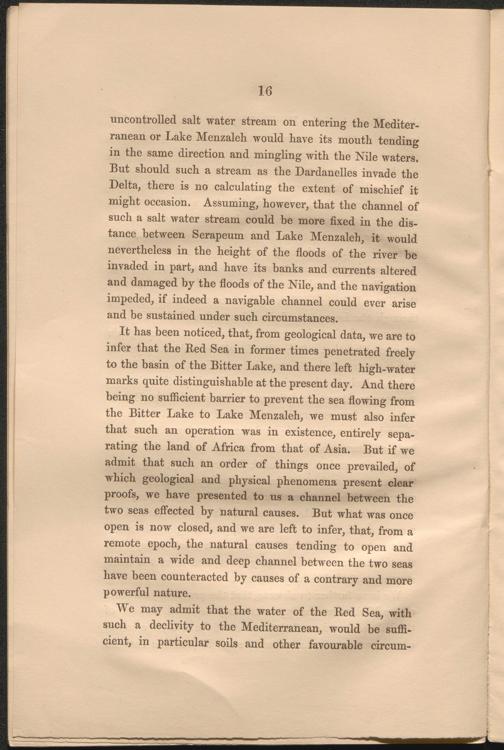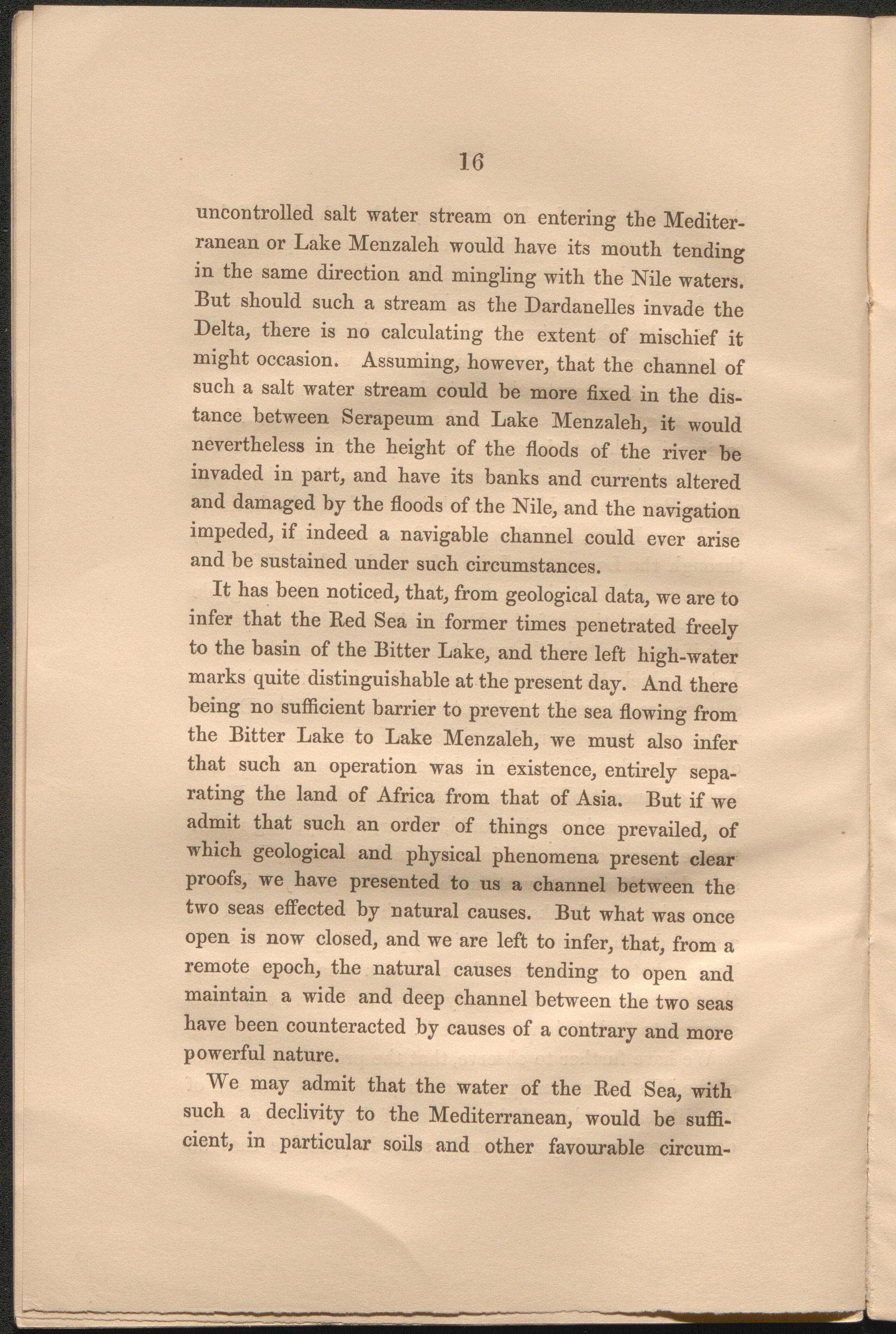 It has been noticed, that, from geological data, we are to infer that the Bed Sea in former times penetrated freely to the basin of the Bitter Lake, and there left high-water marks quite distinguishable at the present day. And there being no sufficient barrier to prevent the sea flowing from the Bitter Lake to Lake Menzaleh, we must also infer that such an operation was in existence, entirely separating the land of Africa from that of Asia. But if we admit that such an order of things once prevailed, of which geological and physical phenomena present clear proofs, we have presented to us a channel between the two seas effected by natural causes. But what was once open is now closed, and we are left to infer, that, from a remote epoch, the natural causes tending to open and maintain a wide and deep channel between the two seas have been counteracted by causes of a contrary and more powerful nature.