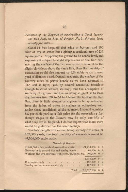 Canal 21 feet deep, 96 feet wide at bottom, and 180 wide at top at water line; giving a sectional area of 322 square yards. Supposing the ground to be nearly level, and supposing it subject to slight depressions on the line connecting the surface of the two seas equal in amount to the slight elevations above the same line, then the quantity of excavation would also amount to 322 cubic yards in each yard of distance; and, from all accounts, the surface of the country must be pretty nearly as we have assumed it. The soil is light, yet, by several accounts, tenacious enough to stand without walling; and the absorption of water by the ground and the air being so great as to leave dry, hollows from 20 to 54 feet below the level of the Red Sea, there is little danger or expense to be apprehended from the influx of water by springs or otherwise; and, under these conditions of the country, I should consider 8 d. per cubic yard as a fair price for the excavation ; for, though wages in the Levant may be only one-fifth of what they are in England, I do not expect that more work would be performed for the same money.