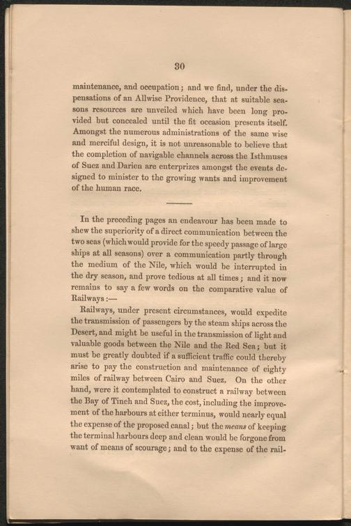 In the preceding pages an endeavour has been made to shew the superiority of a direct communication between the two seas (which would provide for the speedy passage of large ships at all seasons) over a communication partly through the medium of the Nile, which would be interrupted in the dry season, and prove tedious at all times; and it now remains to say a few words on the comparative value of Railways:—