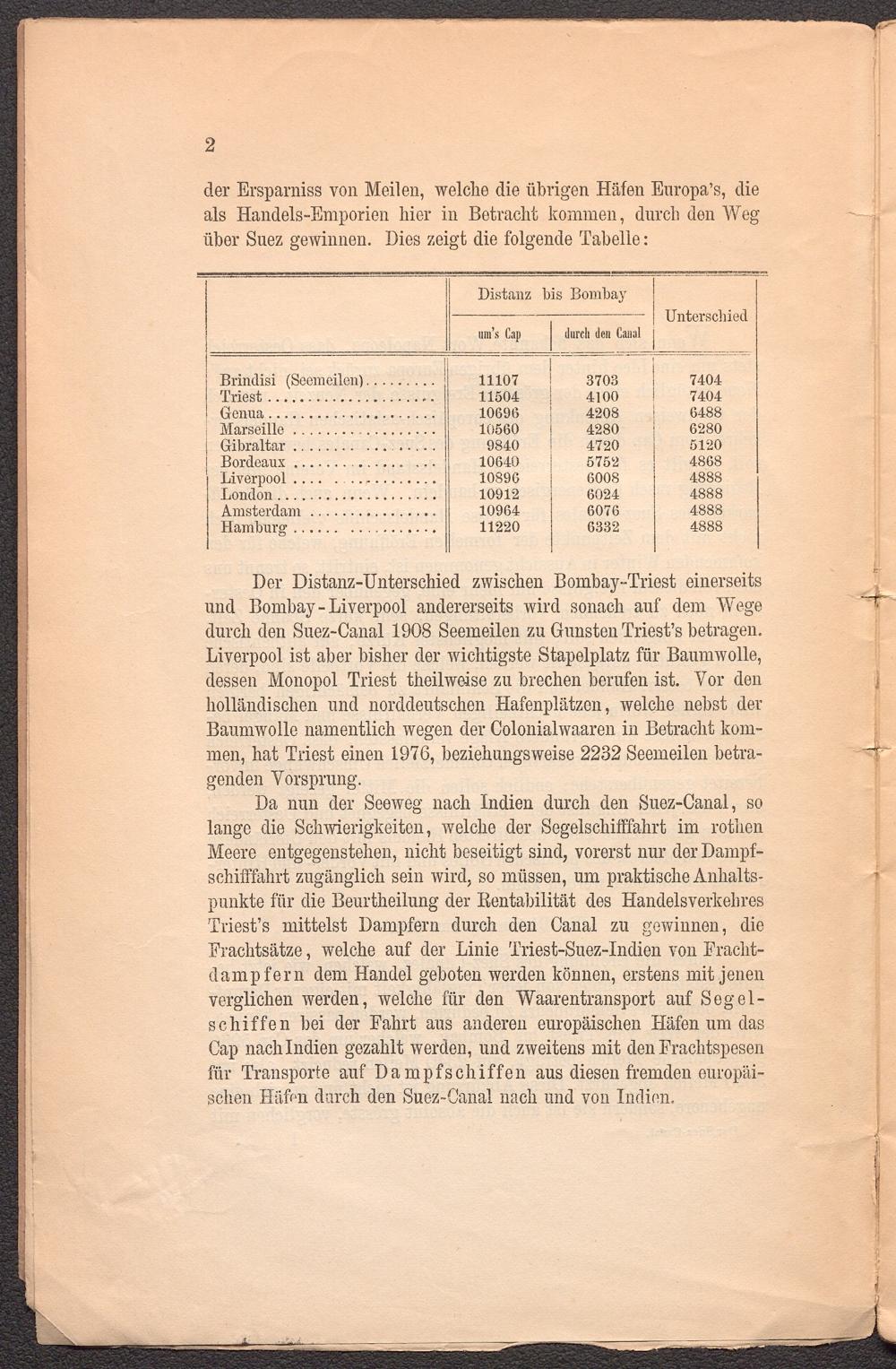 und Bombay-Liverpool andererseits wird sonach auf dem Wege durch den Suez-Canal 1908 Seemeilen zu Gunsten Triest’s betragen.