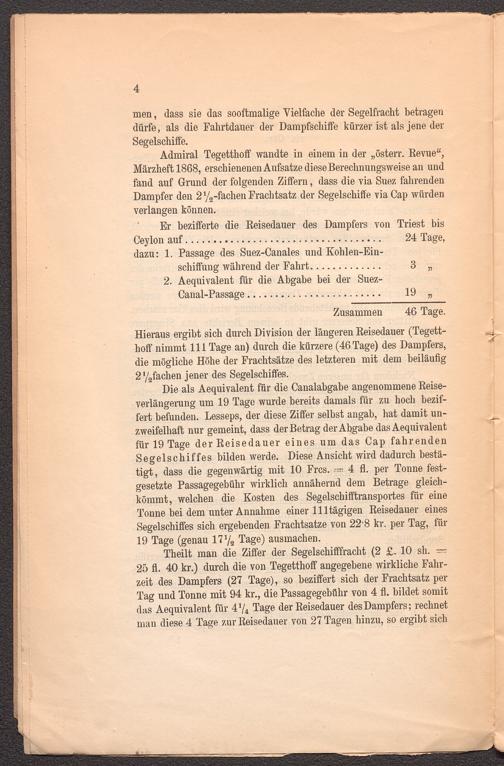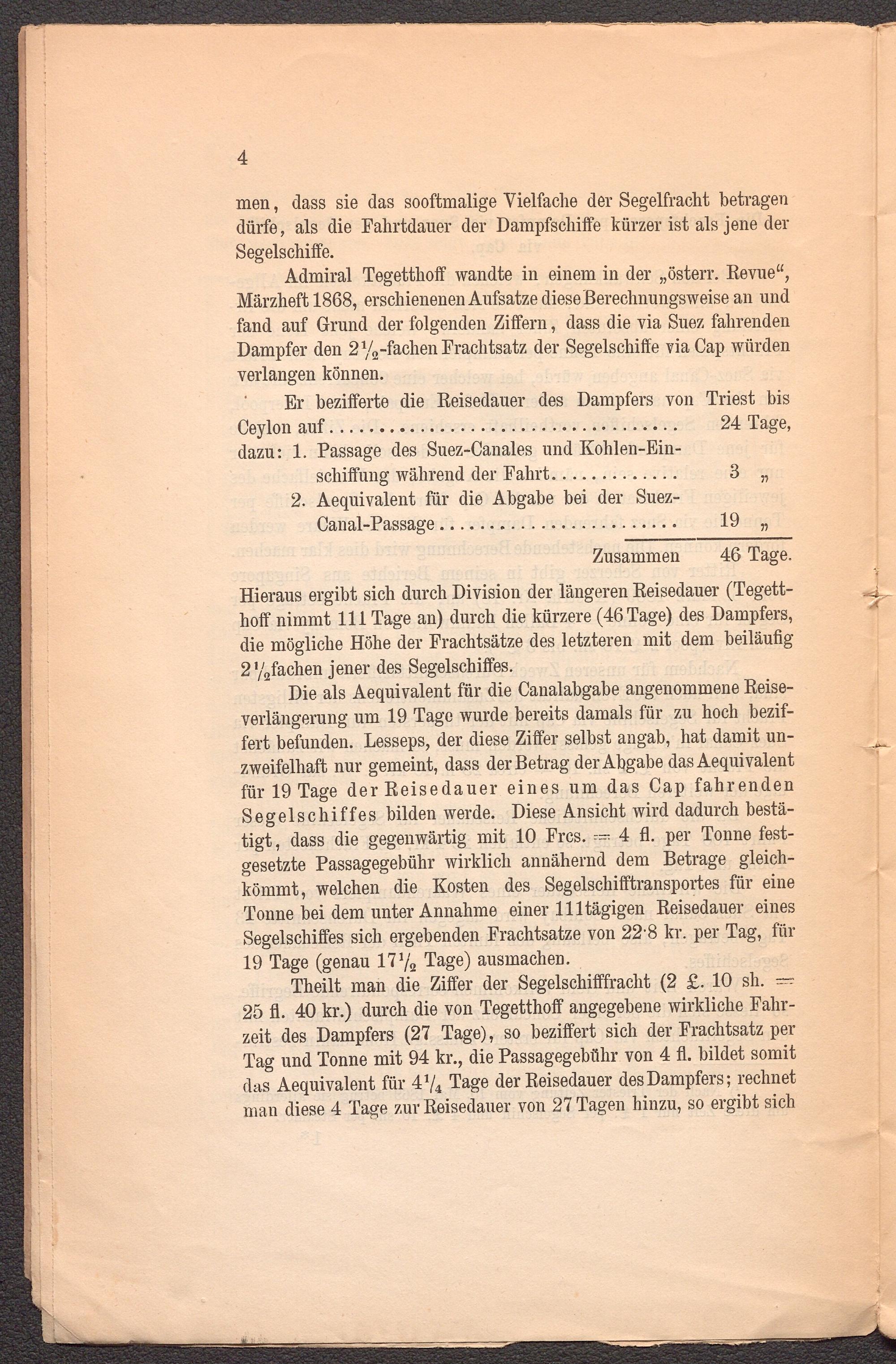 Admiral Tegetthoff wandte in einem in der „österr. Revue“, Märzheft 1868, erschienenen Aufsatze diese Berechnungsweise an und fand auf Grund der folgenden Ziffern, dass die via Suez fahrenden Dampfer den 2 y 2 -fachen Frachtsatz der Segelschiffe via Cap würden verlangen können.
