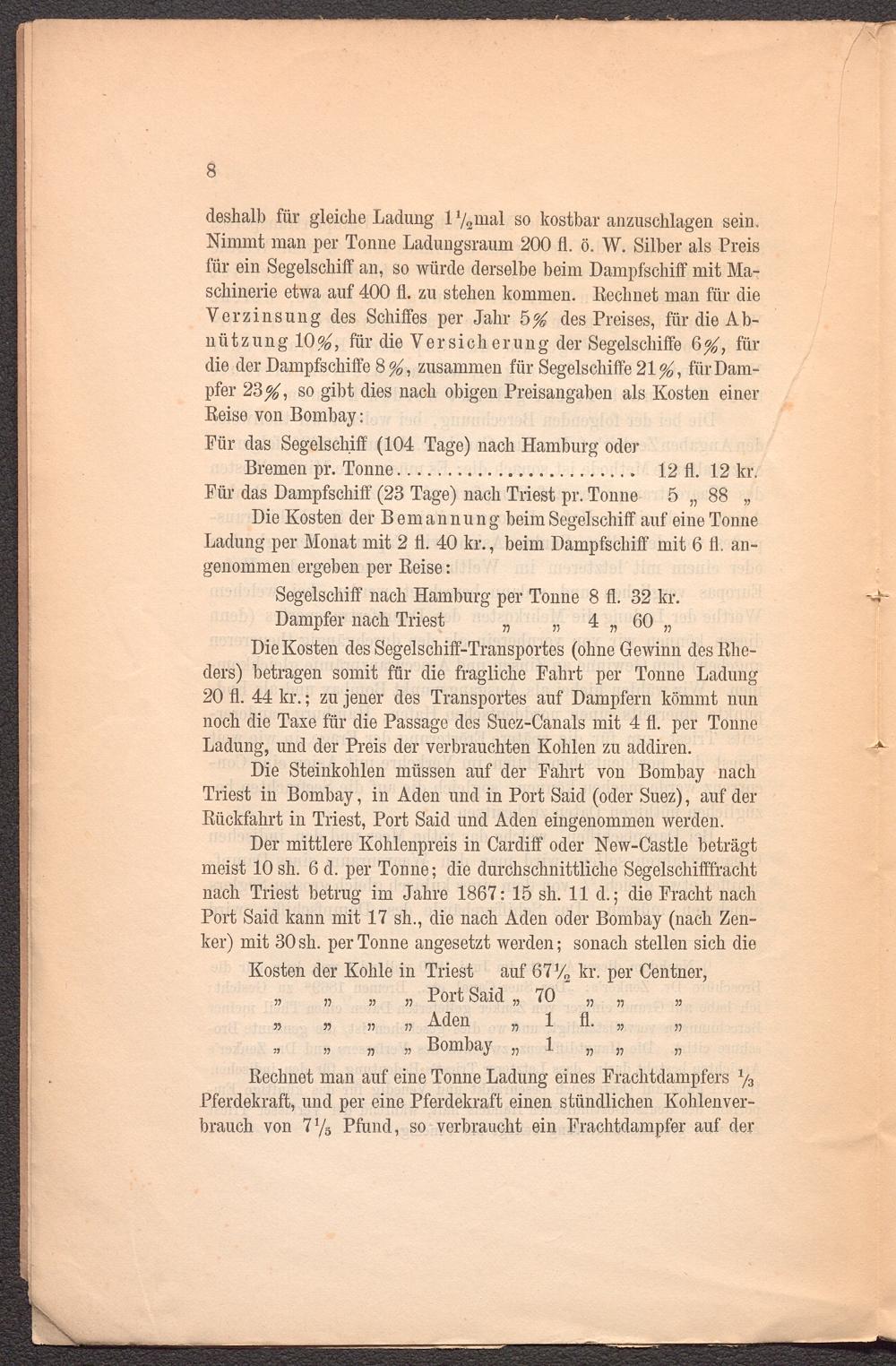 Nimmt man per Tonne Ladungsraum 200 fl. ö. W. Silber als Preis für ein Segelschilf an, so würde derselbe heim Dampfschiff mit Maschinerie etwa auf 400 fl. zu stehen kommen. Kechnet man für die Verzinsung des Schiffes per Jahr 5$ des Preises, für die Abnützung 10$, für die Versieh er ung der Segelschiffe 6 $, für die der Dampfschiffe 8 $, zusammen für Segelschiffe 21$, für Dampfer 23$, so gibt dies nach obigen Preisangaben als Kosten einer Reise von Bombay: