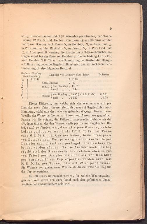 Dieser Differenz, um welche sich der Waarentransport per Dampfer nach Triest theurer stellt als jener auf Segelschiffen nach Hamburg, steht nun der, wie wir gefunden 4%-ige, Gewinn vom Werthe derWaare per Tonne, an Zinsen und Assecuranz gegenüber. Fassen wir die obigen, die Differenz angebenden Beträge als die 4%-igen Zinsen der den YVaarenwerth per Tonne angebenden Beträge auf, so finden wir, dass alle jene Waaren, welche keinen geringeren Werth als 127 fl. 75 kr. per Tonne oder 6 fl. 38 kr. per Centner haben, beim Transporte von Bombay nach Europa mit gleichem Vorth eile per Dampfer nach Triest und per Segel nach Hamburg gebracht werden können; für die Ausfuhr nach Bombay ergibt sich der Grenzwerth, bei welchem eben so gut von Triest per Dampfer via Suez als von Hamburg per Segelschiff via Cap exportirt werden kann, mit 94 fl. 50 kr. per Tonne, oder 4 fl. 72 kr. per Centner; für Waaren von geringerem Werthe als diesem wäre der Weg um das Cap vorzuziehen.
