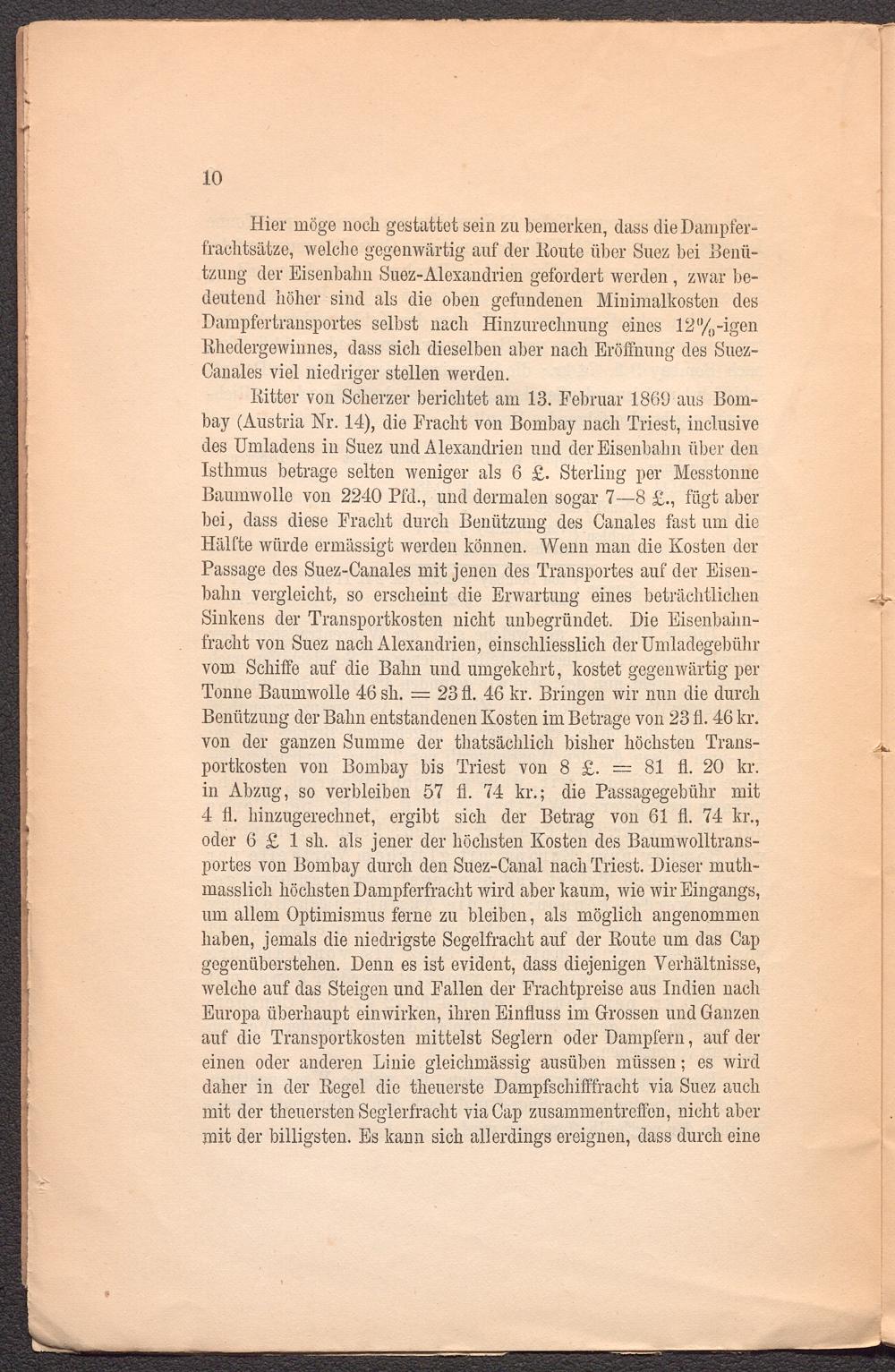 Ritter von Scherzer berichtet am 13. Februar 1869 aus Bombay (Austria Nr. 14), die Fracht von Bombay nach Triest, inclusive des Umladens in Suez und Alexandrien und der Eisenbahn über den Isthmus betrage selten weniger als 6 £. Sterling per Messtonne Baumwolle von 2240 Pfd., und dermalen sogar 7—8 £., fügt aber bei, dass diese Fracht durch Benützung des Canales fast um die Hälfte würde ermässigt werden können. Wenn man die Kosten der Passage des Suez-Canales mit jenen des Transportes auf der Eisenbahn vergleicht, so erscheint die Erwartung eines beträchtlichen Sinkens der Transportkosten nicht unbegründet. Die Eisenbahnfracht von Suez nach Alexandrien, einschliesslich der Umladegebühr vom Schiffe auf die Bahn und umgekehrt, kostet gegenwärtig per Tonne Baumwolle 46 sh. = 23 fl. 46 kr. Bringen wir nun die durch Benützung der Bahn entstandenen Kosten im Betrage von 23 fl. 46 kr. von der ganzen Summe der thatsächlich bisher höchsten Transportkosten von Bombay bis Triest von 8 £. = 81 fl. 20 kr. in Abzug, so verbleiben 57 fl. 74 kr.; die Passagegebühr mit 4 fl. hinzugerechnet, ergibt sich der Betrag von 61 fl. 74 kr., oder 6 £ 1 sh. als jener der höchsten Kosten des Baumwolltrans- portes von Bombay durch den Suez-Canal nach Triest. Dieser muth- masslich höchsten Dampferfracht wird aber kaum, wie wir Eingangs, um allem Optimismus ferne zu bleiben, als möglich angenommen haben, jemals die niedrigste Segelfracht auf der Route um das Cap gegenüberstehen. Denn es ist evident, dass diejenigen Verhältnisse, welche auf das Steigen und Fallen der Frachtpreise aus Indien nach Europa überhaupt ein wirken, ihren Einfluss im Grossen und Ganzen auf die Transportkosten mittelst Seglern oder Dampfern, auf der einen oder anderen Linie gleichmässig ausüben müssen; es wird daher in der Regel die theuerste Dampfschifffracht via Suez auch mit der theuersten Seglerfracht via Cap Zusammentreffen, nicht aber mit der billigsten. Es kann sich allerdings ereignen, dass durch eine