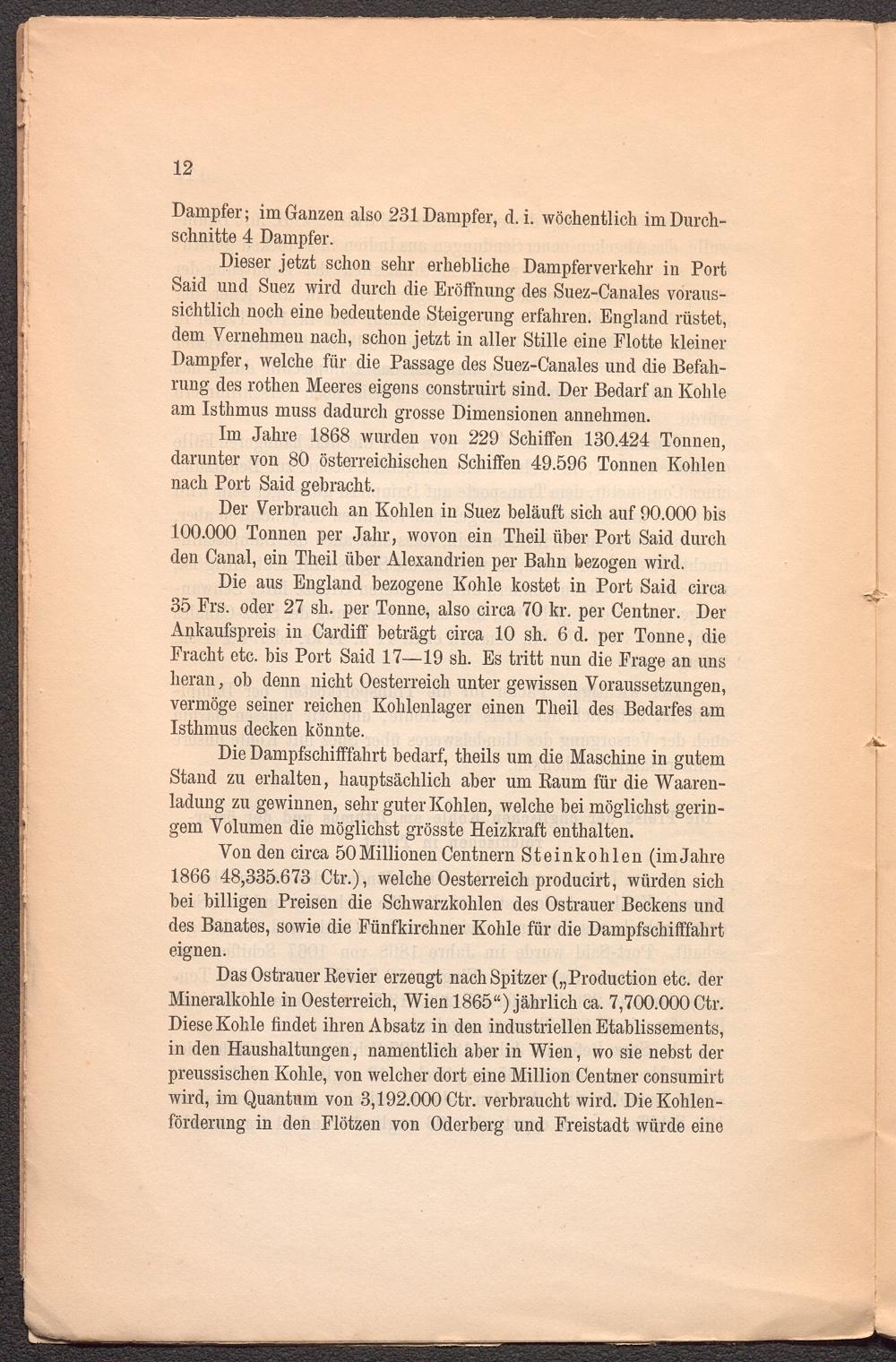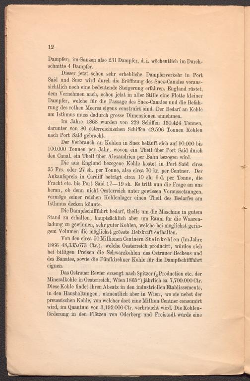 Im Jahre 1868 wurden von 229 Schiffen 130.424 Tonnen, darunter von 80 österreichischen Schiffen 49.596 Tonnen Kohlen nach Port Said gebracht.