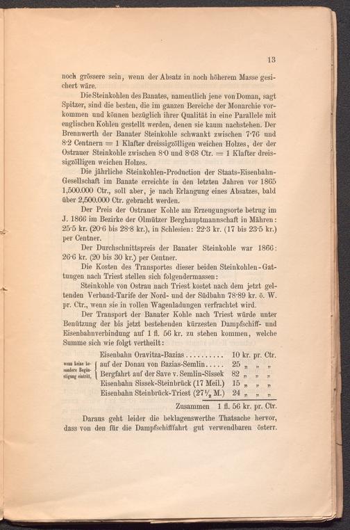 Der Transport der Banater Kohle nach Triest würde unter Benützung der bis jetzt bestehenden kürzesten Dampfschiff- und Eisenbahnverbindung auf 1 fl. 56 kr. zu stehen kommen, welche