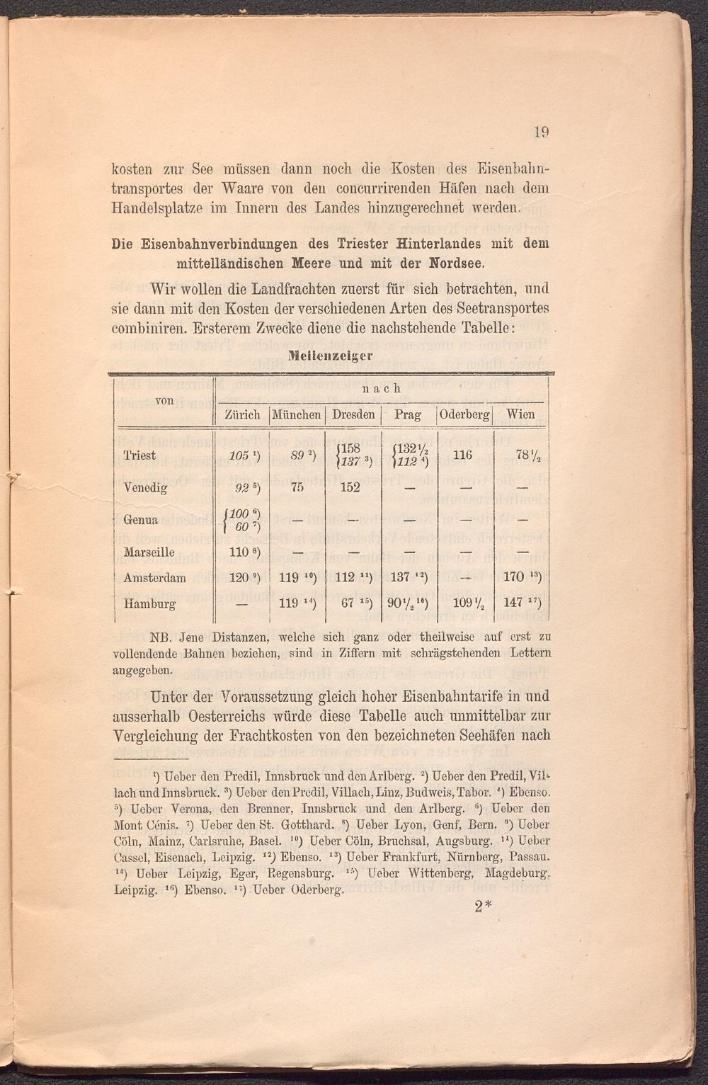 Unter der Voraussetzung gleich hoher Eisenbahntarife in und ausserhalb Oesterreichs würde diese Tabelle auch unmittelbar zur Vergleichung der Frachtkosten von den bezeichneten Seehäfen nach