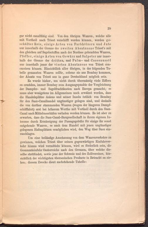 gar nicht canalfähig sind. Von den übrigen Waaren, welche alle mit Vortheil nach Triest verschifft werden können, werden geschälter Reis, einige Arten von Farbhölzern und Jute nur innerhalb der Grenze der zweiten Absatzzone Triest’s mit den gleichen auf Segelschiffen nach der Nordsee gebrachten Waaren, Pfeffer, einige Arten von Gewürz und Salpeter nur innerhalb der Grenze der dritten, und Palm- und Cocosnussöl nur innerhalb jener der vierten Absatzzone von Triest con- eurriren können. Hinsichtlich aller übrigen, in der folgenden Tabelle genannten Waaren sollte, soferne sie aus Bombay kommen, der Absatz von Triest aus in ganz Deutschland möglich sein.