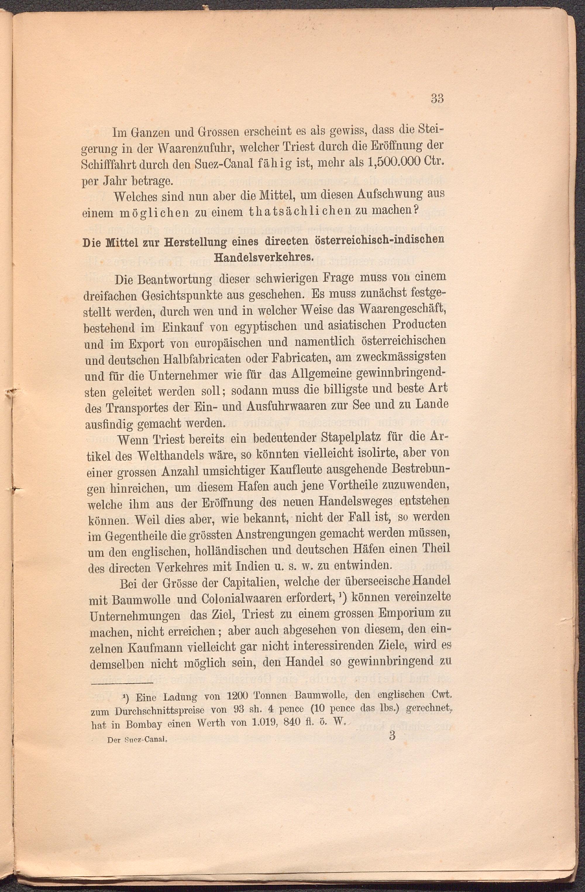 Wenn Triest bereits ein bedeutender Stapelplatz für die Artikel des Welthandels wäre, so könnten vielleicht isolirte, aber von einer grossen Anzahl umsichtiger Kaufleute ausgehende Bestrebungen hinreichen, um diesem Hafen auch jene Vortheile zuzuwenden, welche ihm aus der Eröffnung des neuen Handelsweges entstehen können. Weil dies aber, wie bekannt, nicht der Fall ist, so werden im Gegentheile die grössten Anstrengungen gemacht werden müssen, um den englischen, holländischen und deutschen Häfen einen Theil des directen Verkehres mit Indien u. s. w. zu entwinden.