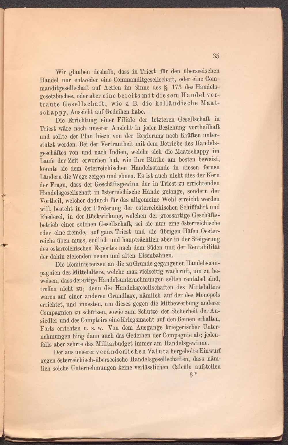 Wir glauben deshalb, dass in Triest für den überseeischen Handel nur entweder eine Commanditgesellschaft, oder eine Com- manditgesellschaft auf Actien im Sinne des §. 173 des Handelsgesetzbuches, oder aber eine bereits mit diesem Handel vertraute Gesellschaft, wie z. B. die holländische Maat- schappy, Aussicht auf Gedeihen habe.