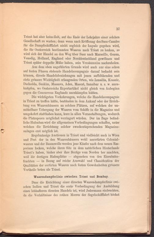 Aus dem oben angeführten Grunde wird auch nur eine schon auf festen Füssen stehende Handelscompagnie darauf bedacht sein können, directe Handelsbeziehungen mit jenen auf blühenden und stets grössere Wichtigkeit erlangenden Orten, wie Ismailia, Kosseir, Dschedda, Suakim, Massava, Aden, Mascat, Sansibar u. s. w. anzuknüpfen, wo Oesterreichs Exportartikel nicht gleich von Anbeginn gegen die Concurrenz Englands anzukämpfen hätten.