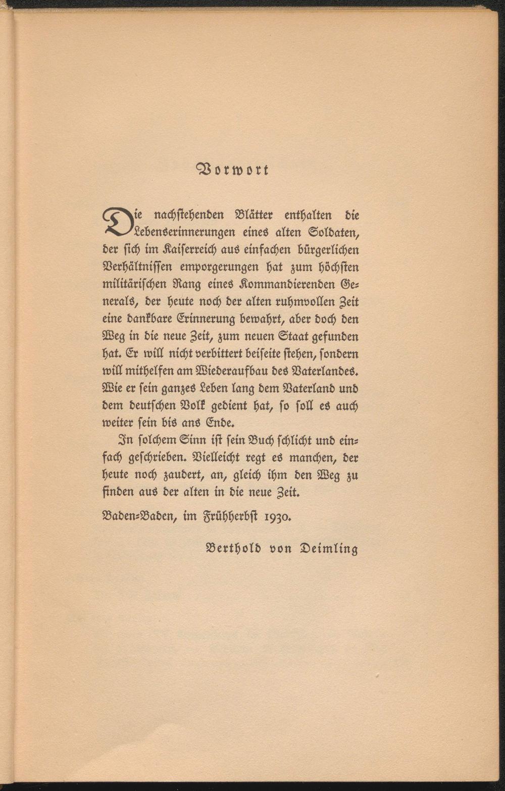 (^Xie nachstehenden Blätter enthalten die -^^Lebensermnerungen eines alten Soldaten, der sich im Kaiserreich aus einfachen bürgerlichen Verhältnissen emporgerungen hat zum höchsten militärischen Rang eines Kommandierenden Generals, der heute noch der alten ruhmvollen Zeit eine dankbare Erinnerung bewahrt, aber doch den Weg in die neue Zeit, zum neuen Staat gefunden hat. Er will nicht verbittert beiseite stehen, sondern will mithelfen am Wiederaufbau des Vaterlandes. Wie er sein ganzes Leben lang dem Vaterland und dem deutschen Volk gedient hat, so soll es auch weiter sein bis anS Ende.