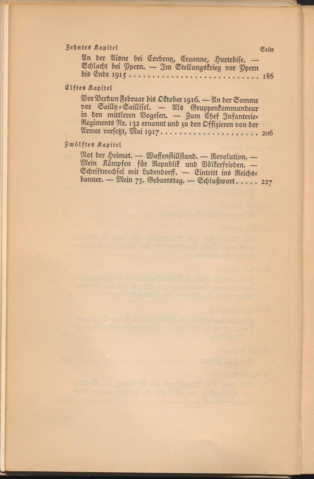 Not der Heimat. — Waffenstillstand. — Revolution. — Mein Kämpfen für Republik und Völkerfrieden. — Schriftwechsel mit Ludendorff. — Eintritt ins Reichsbanner. — Mein 75. Geburtstag. — Schlußwort..... 227