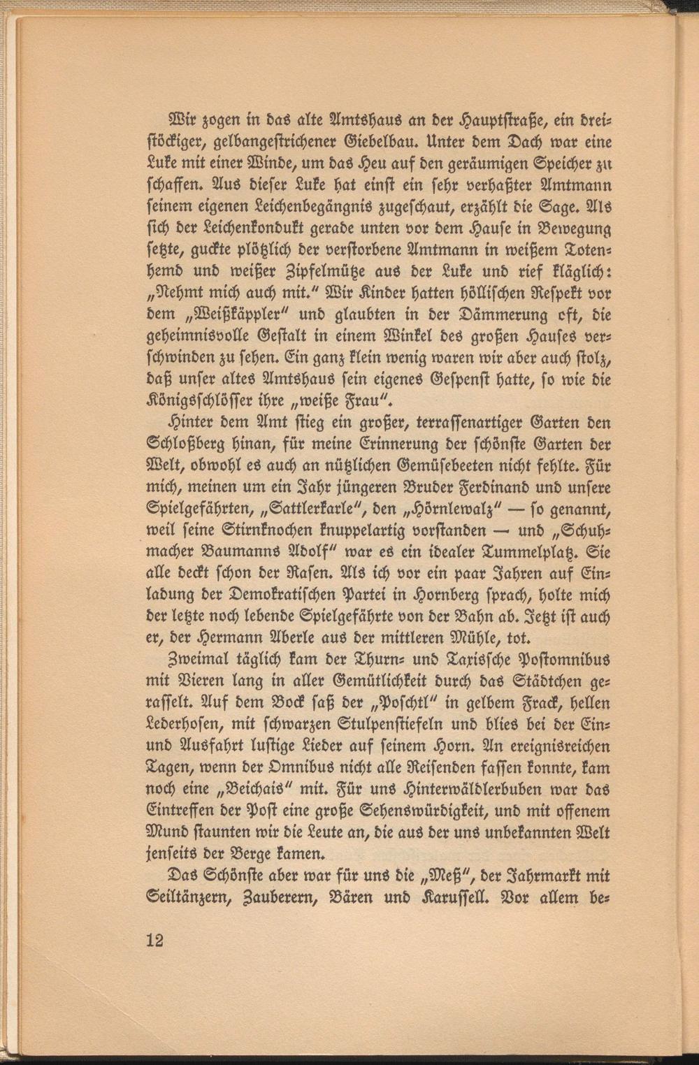 Hinter dem Amt stieg ein großer, terrassenartiger Garten den Schloßberg hinan, für meine Erinnerung der schönste Garten der Welt, obwohl eö auch an nützlichen Gemüsebeeten nicht fehlte. Für mich, meinen um ein Jahr jüngeren Bruder Ferdinand und unsere Spielgefährten, „Sattlerkarle", den „Hörnlewalz" — so genannt, weil seine Stirnknochen knuppelartig vorstanden — und „Schuhmacher Baumanns Adolf" war es ein idealer Tummelplatz. Sie alle deckt schon der Rasen. Als ich vor ein paar Jahren auf Einladung der Demokratischen Partei in Hornberg sprach, holte mich der letzte noch lebende Spielgefährte von der Bahn ab. Jetzt ist auch er, der Hermann Aberle aus der mittleren Mühle, tot.
