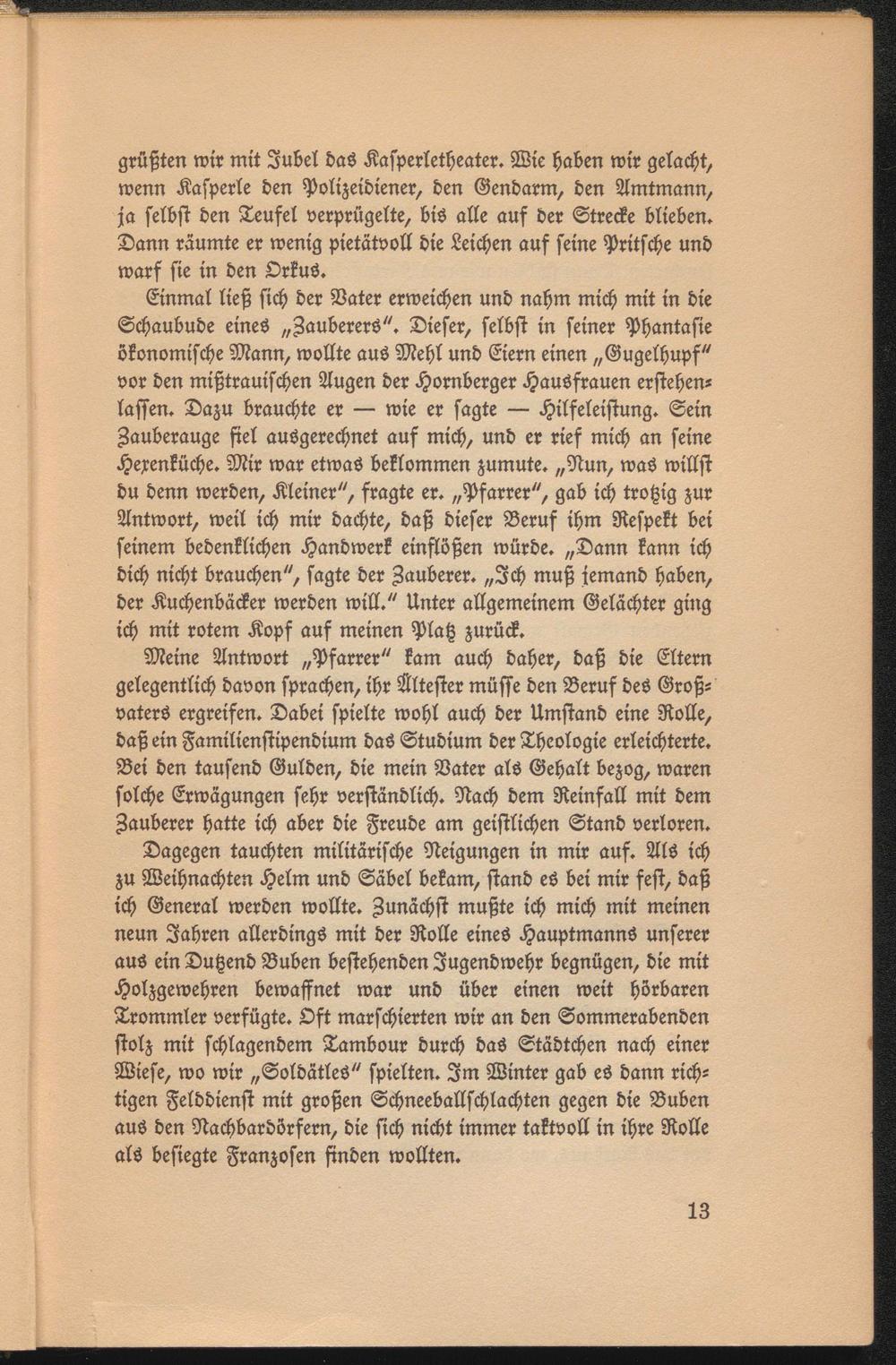 Dagegen tauchten militärische Neigungen in mir auf. Als ich zu Weihnachten Helm und Säbel bekam, stand es bei mir fest, daß ich General werden wollte. Zunächst mußte ich mich mit meinen neun Jahren allerdings mit der Rolle eines Hauptmannö unserer aus ein Dutzend Buben bestehenden Jugendwehr begnügen, die mit Holzgewehren bewaffnet war und über einen weit hörbaren Trommler verfügte. Oft marschierten wir an den Sommerabenden stolz mit schlagendem Tambour durch das Städtchen nach einer Wiese, wo wir „Soldätles" spielten. Im Winter gab eS dann richtigen Felddienst mit großen Schneeballschlachten gegen die Buben aus den Nachbardörfern, die sich nicht immer taktvoll in ihre Rolle als besiegte Franzosen finden wollten.