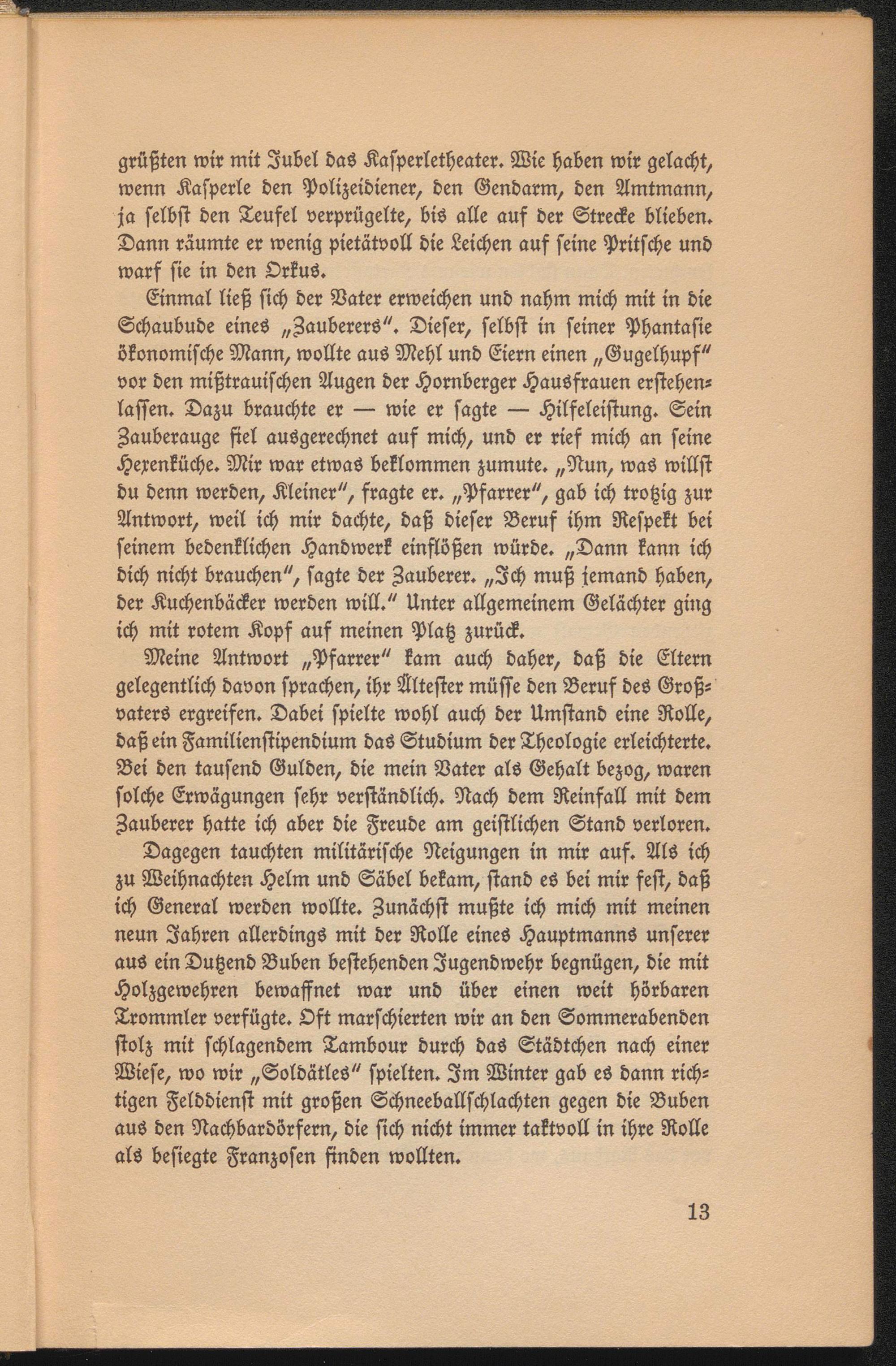 Einmal ließ sich der Vater erweichen und nahm mich mit in die Schaubude eines „Zauberers". Dieser, selbst in seiner Phantasie ökonomische Mann, wollte aus Mehl und Eiern einen „Gugelhupf" vor den mißtrauischen Augen der Hornberger Hausfrauen erstehen- laffen. Dazu brauchte er — wie er sagte — Hilfeleistung. Sein Zauberauge fiel ausgerechnet auf mich, und er rief mich an seine Hexenküche. Mir war etwas beklommen zumute. „Nun, was willst du denn werden, Kleiner", fragte er. „Pfarrer", gab ich trotzig zur Antwort, weil ich mir dachte, daß dieser Beruf ihm Respekt bei seinem bedenklichen Handwerk einflößen würde. „Dann kann ich dich nicht brauchen", sagte der Zauberer. „Ich muß jemand haben, der Kuchenbäcker werden will." Unter allgemeinem Gelächter ging ich mit rotem Kopf auf meinen Platz zurück.