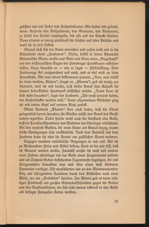 Meine Antwort „Pfarrer" kam auch daher, daß die Eltem gelegentlich davon sprachen, ihr Ältester müsse den Beruf des Großvaters ergreifen. Dabei spielte wohl auch der Umstand eine Rolle, daß ein Familienstipendium das Studium der Theologie erleichterte. Bei den tausend Gulden, die mein Vater als Gehalt bezog, waren solche Erwägungen sehr verständlich. Nach dem Reinfall mit dem Zauberer hatte ich aber die Freude am geistlichen Stand verloren.